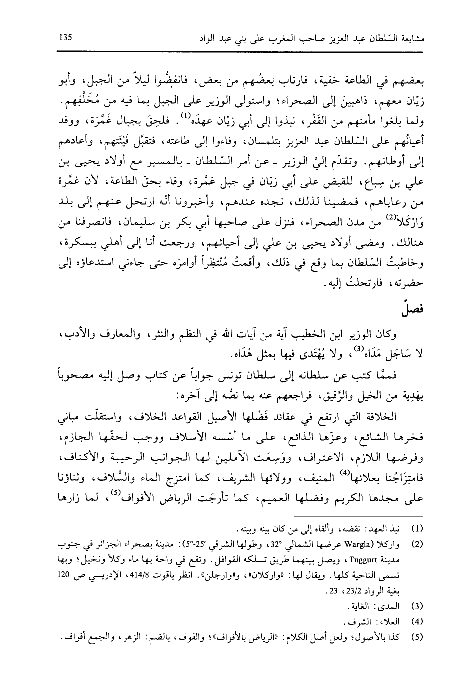أنه ارتحل عنهم إلى بلد وَارْكَلاَ من مدن الصحراء، فنزل على صاحبها أبي بكر بن سليمان، فانصرفنا من هنالك. ومضى أولاد يحيى بن علي إلى أحيائهم، ورجعت أنا إلى أهلي ببسكرة، وخاطبت السلطان بما وقع في ذلك، وأقمت منتظراً أوامره حتى جاءني استدعاؤه إلى حضرته، فارتحلت إليه.