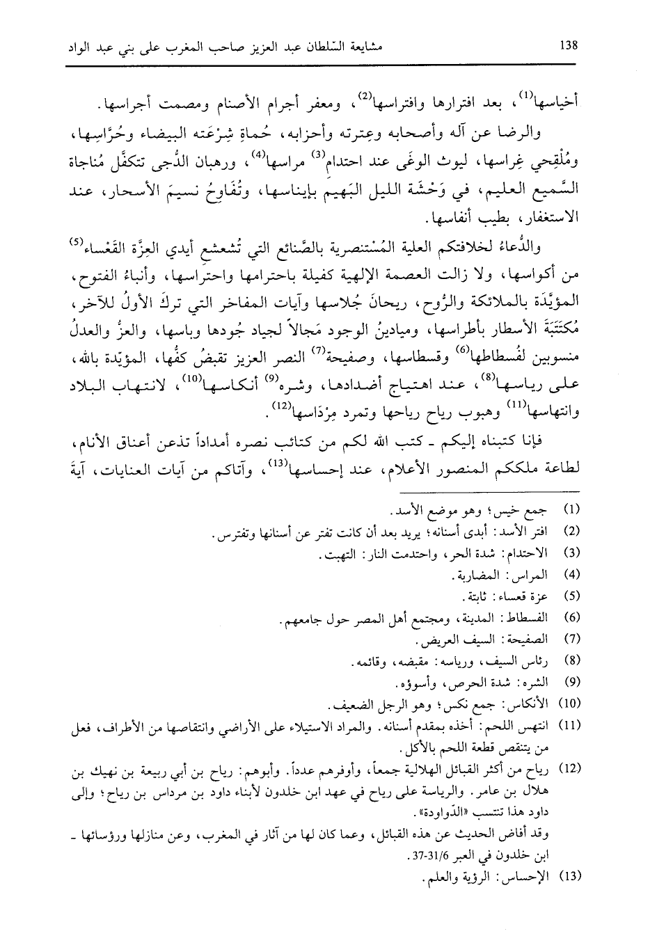 والدعاء لخلافتكم العلية المستنصرية بالصنائع التي تشعشع أيدي العزة القعساء من أكواسها، ولا زالت العصمة الإلهية كفيلة باحترامها واحتراسها، وأنباء الفتوح، المؤيدة بالملائكة والروح، ريحان جلاسها وآيات المفاخر التي ترك الأول للآخر، مكتتبة الأسطار بأطراسها، وميادين الوجود مجالاً لجياد جودها وبأسها، والعز والعدل منسوبين لفسطاطها وقسطاسها، وصفيحة النصر العزيز تقبض كفها، المؤيدة بالله، على رياسها، عند اهتياج أضدادها، وشره أنكاسها، لانتهاب البلاد وانتهاسها وهبوب رياح رياحها وتمرد مرداسها.