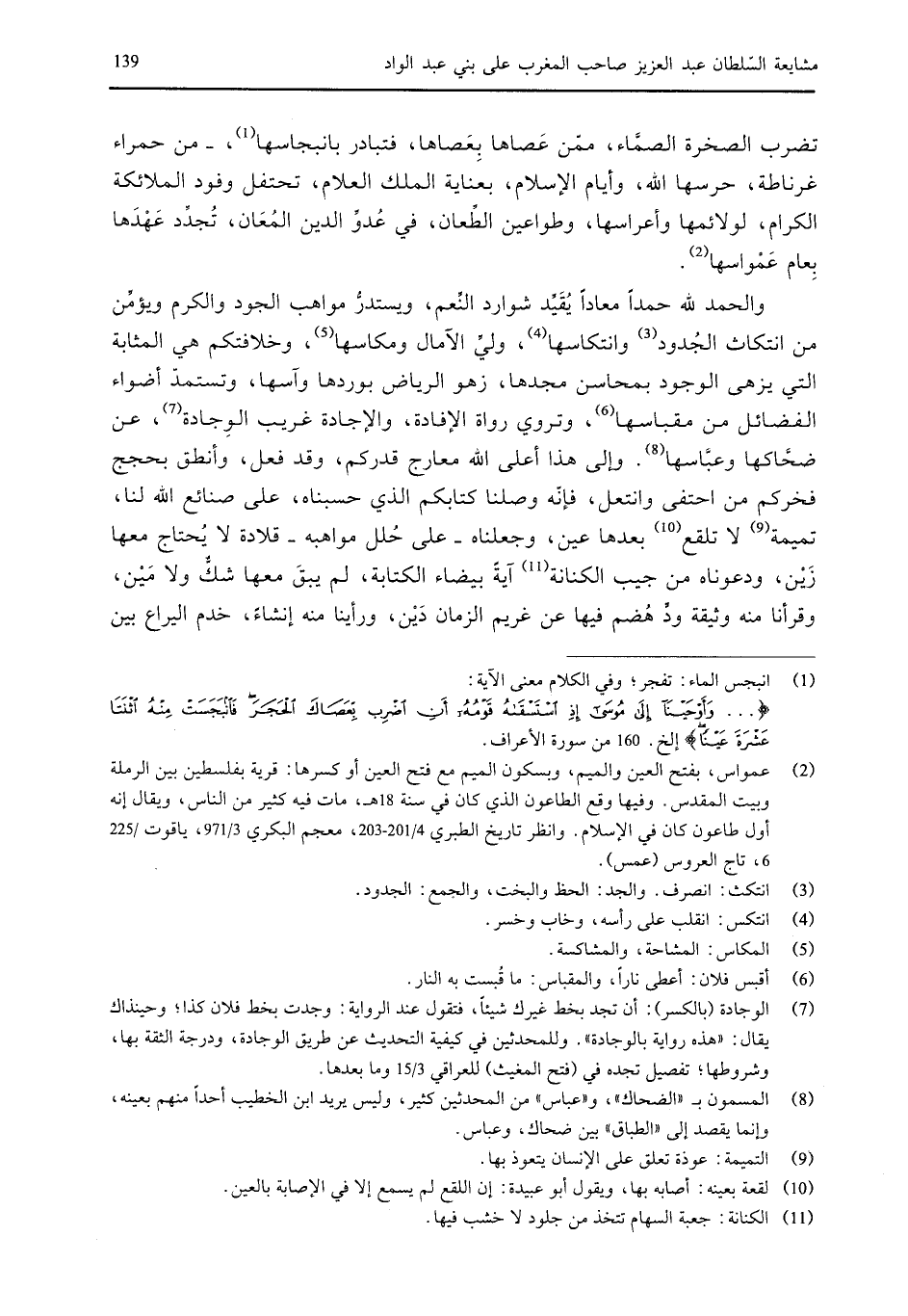 والحمد لله حمداً معاداً يقيد شوارد النعم، ويستدر مواهب الجود والكرم ويؤمن من انتكاث الجدود وانتكاسها، ولي الآمال ومكاسها، وخلافتكم هي المثابة التي يزهى الوجود بمحاسن مجدها، زهو الرياض بوردها وآسها، وتستمد أضواء الفضائل