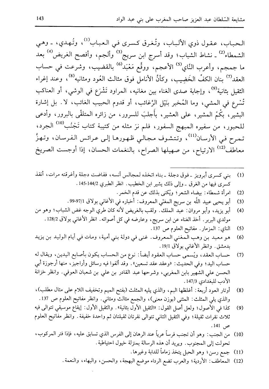 الحباب، عقول ذوي الألباب، وتغرق كسرى في العباب، وتهدي، - وهي الشمطاء - نشاط الشباب؛ وقد أسرج ابن سريج وألجم، وأفصح الغريض بعد ما جمجم، وأعرب الناي الأعجم، ووقع معبد بالقضيب، وشرعت في حساب العقد بنان الكف الخضيب، وكأن الأنامل فوق مثالث العود ومثانيه، وعند إغراء الثقيل بثانية، وإجابة صدى الغناء بين مغانيه، المراود تشرع في الوشي، أو العناكب تسرع في المشي، وما المخبر بنيل الرغائب، أو قدوم الحبيب الغائب، لا. بل إشارة البشير،