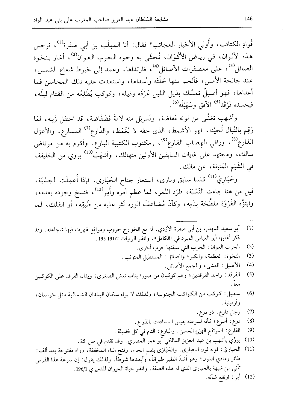 قواد الكتائب، وأولي الأخبار العجائب؟ فقال: أنا المهلب بن أبي صفرة، نرجس هذه الألوان، في رياض الأكوان، تحثى به وجوه الحرب العوان، أغار بنخوة الصائل، على معصفرات الأصائل، فارتداها، وعمد إلى خيوط شعاع الشمس، عند جانحة الأمس، فألحم منها حلته وأسداها، واستعدت عليه تلك المحاسن فما أعداها، فهو أصيل تمسك بذيل الليل عرفه وذيله، وكوكب يطلعه من القتام ليله، فيحسده فرقد الأفق وسهيله.
