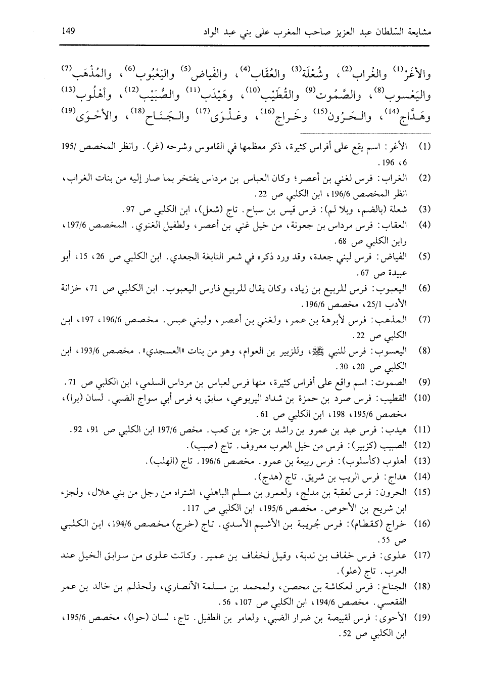 والأغر والغراب، وشعلة والعقاب، والفياض واليعبوب، والمذهب واليعسوب، والصموت والقطيب، وهيدب والصبيب، وأهلوب وهداج، والحرون وخراج، وعلوى والجناح، والأحوى