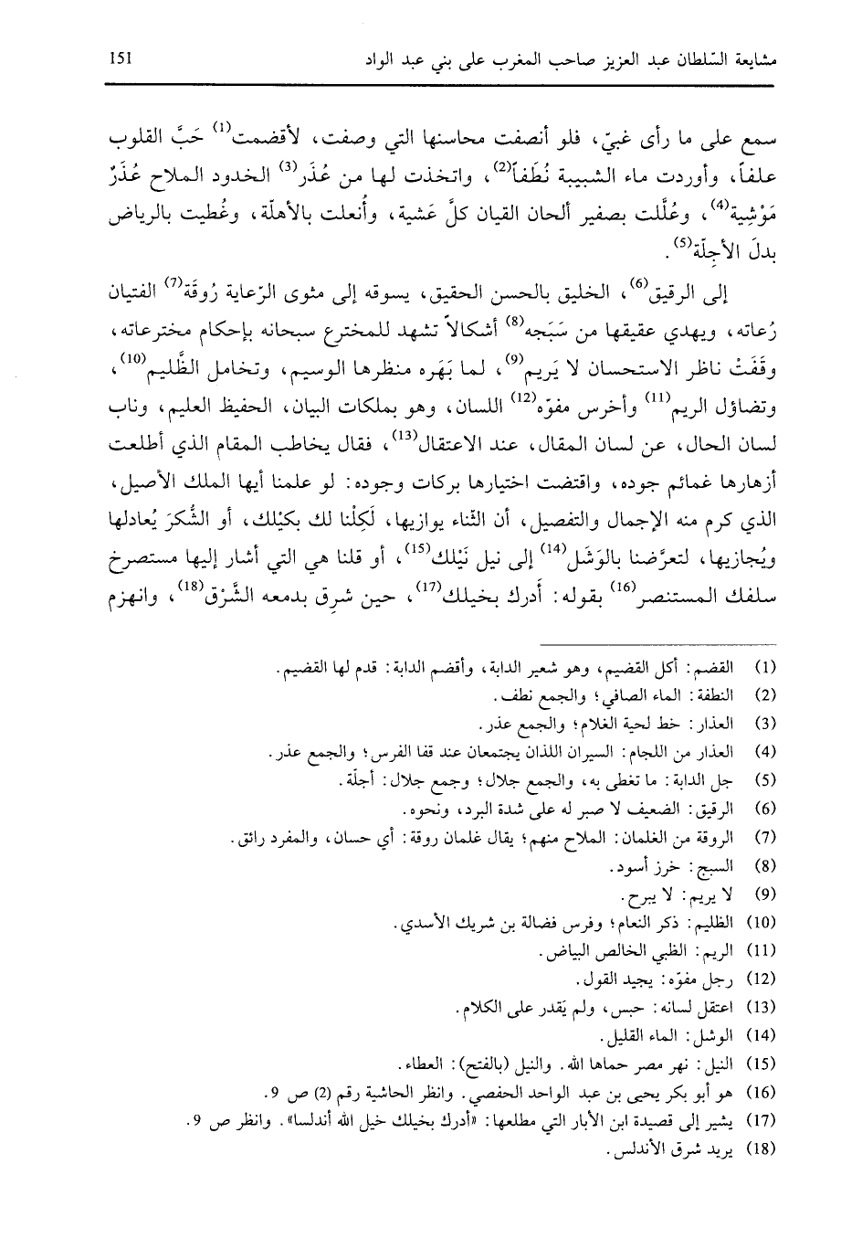 إلى الرقيق، الخليق بالحسن الحقيق، يسوقه إلى مثوى الرعاية روقة الفتيان رعاته، ويهدي عقيقها من سبجه أشكالاً تشهد للمخترع سبحانه بإحكام مخترعاته، وقفت ناظر الاستحسان لا يريم، لما بهره منظرها الوسيم، وتخامل الظليم، وتضاؤل الريم وأخرس مفوه اللسان، وهو بملكات البيان، الحفيظ العليم، وناب لسان الحال، عن لسان المقال، عند الاعتقال، فقال يخاطب المقام الذي أطلعت أزهارها غمائم جوده، واقتضت اختيارها بركات وجوده: لو علمنا أيها الملك الأصيل، الذي كرم منه الإجمال والتفضيل، أن الثناء يوازيها، لكلنا لك بكيلك، أو الشكر يعادلها ويجازيها، لتعرضنا بالوشل إلى نيل نيلك، أو قلنا هي التي أشار إليها مستصرخ سلفك المستنصر بقوله: أدرك بخيلك، حين شرق بدمعه الشرق، وانهزم