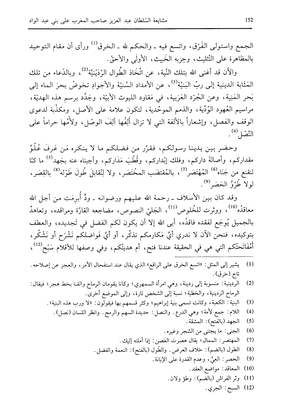 والآن قد أغنى الله بتلك النية، عن اتخاذ الطوال الردينية، وبالدعاء من تلك المثابة الدينية إلى رب البنية، عن الأمداد السنية والأجواد تخوض بحر الماء إلى بحر المنية، وعن الجرد العربية، في مقاود الليوث الأبية، وجدد برسم هذه الهدية، مراسيم العهود الودية، والذمم الموحدية، لتكون علامة على الأصل، ومكذبة لدعوى الوقف والفصل، وإشعاراً بالألفة التي لا تزال ألفها ألف الوصل، ولأمها حراماً على النصل.