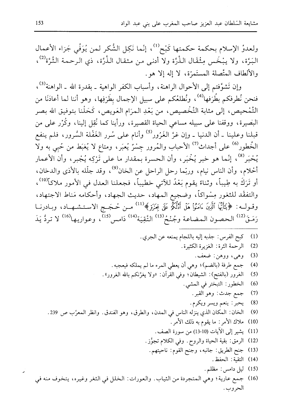 وإن تشوفتم إلى الأحوال الراهنة، وأسباب الكفر الواهية - بقدرة الله - الواهنة، فنحن نطرفكم بطرفها، ونطلعكم على سبيل الإجمال بطرفها، وهو أننا لما أعادنا من التمحيص، إلى مثابة التخصيص، من بعد المرام العويص، كحلنا بتوفيق الله بصر البصيرة، ووقفنا على سبيله مساعي الحياة القصيرة، ورأينا كما نقل إلينا، وكرر على من قبلنا وعلينا - أن الدنيا - وإن غر الغرور وأنام على سرر الغفلة السرور، فلم ينفع الخطور على أجداث الأحباب والمرور جسر يعبر، ومتاع لا يغبط من حبي به ولا يحبر، إنما هو خبر يخبر، وأن الحسرة بمقدار ما على تركه يجبر، وأن الأعمار أحلام، وأن الناس نيام، وربما رحل الراحل عن الخان، وقد جلله بالأذى والدخان، أو ترك به طيباً، وثناء يقوم بعد للآتي خطيباً، فجعلنا العدل في الأمور ملاكاً، والتفقد للثغور مسواكاً، وضجيع المهاد، حديث الجهاد، وأحكامه مناط الاجتهاد، وقوله: يا أيها الذين آمنوا هل أدلكم على تجارة من حجج الاستشهاد، وبادرنا رمق الحصون المضاعة وجنح التقية دامس، وعواريها لا ترد يد