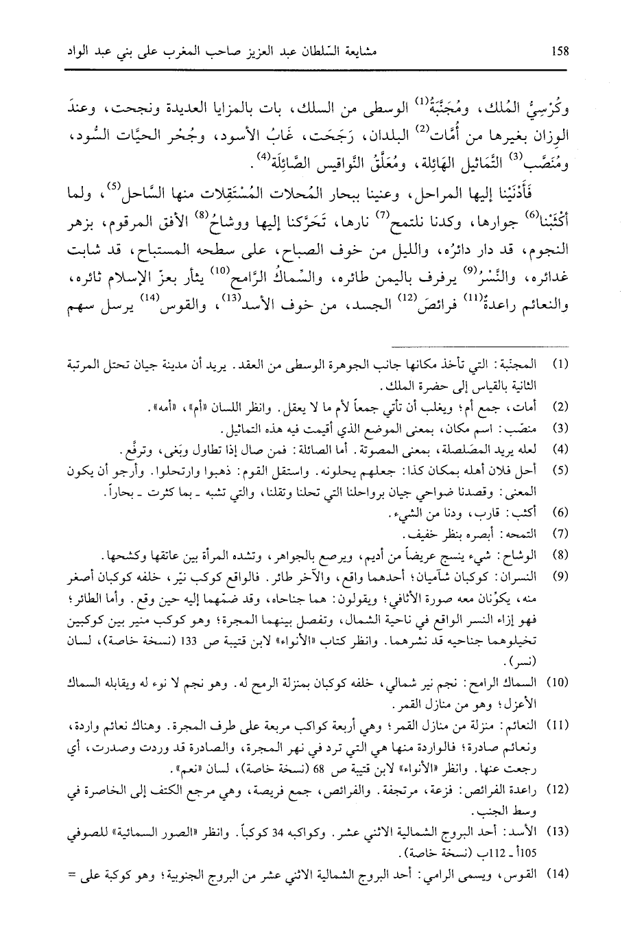 فأدنينا إليها المراحل، وعنينا ببحار المحلات المستقلات منها الساحل، ولما أكثبنا جوارها، وكدنا نلتمح نارها، تحركنا إليها ووشاح الأفق المرقوم، بزهر النجوم، قد دار دائره، والليل من خوف الصباح، على سطحه المستباح، قد شابت غدائره، والنسر يرفرف باليمن طائره، والسماك الرامح يثأر بعز الإسلام ثائره، والنعائم راعدة فرائص الجسد، من خوف الأسد، والقوس يرسل سهم