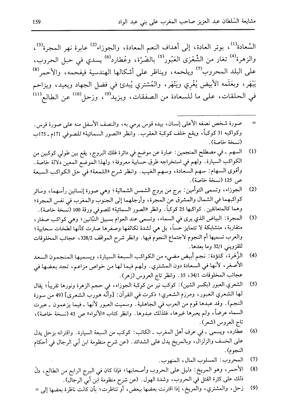 السعادة، بوتر العادة، إلى أهداف النعم المعادة، والجوزاء عابرة نهر المجرة، والزهرة تغار من الشعرى العبور بالضرة، وعطارد يسدي في حبل الحروب، على البلد المحروب ويلحمه، ويناظر على أشكالها الهندسية فيفحمه، والأحمر يبهر، وبعلمه الأبيض يغري وينهر، والمشتري يبدئ في فضل الجهاد ويعيد، ويزاحم في الحلقات، على ما للسعادة من الصفقات، ويزيد، وزحل عن الطالع