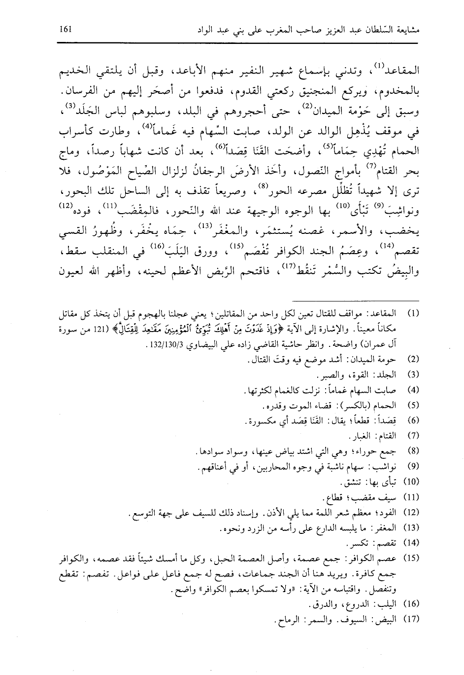 المقاعد، وتدني بأسماع شهير النفير منهم الأباعد، وقبل أن يلتقي الخديم بالمخدوم، ويركع المنجنيق ركعتي القدوم، فدفعوا من أصحر إليهم من الفرسان. وسبق إلى حومة الميدان، حتى أحجروهم في البلد، وسلبوهم لباس الجلد، في موقف يذهل الوالد عن الولد، صابت السهام فيه غماماً، وطارت كأسراب الحمام تهدى حماماً، وأضحت القنا قصداً، بعد أن كانت شهاباً رصداً، وماج بحر القتام بأمواج النصول، وأخذ الأرض الرجفان لزلزال الصياح الموصول، فلا ترى إلا شهيداً تظلل مصرعه الحور، وصريعاً تقذف به إلى الساحل تلك البحور، ونواشب تبأى بها الوجوه الوجيهة عند الله والنحور، فالمقضب، فوده يخضب، والأسمر، غصنه يستثمر، والمغفر، حماه يخفر، وظهور القسي تقصم، وعصم الجند الكوافر تفصم، وورق اليلب في المنقلب يسقط، والبيض تكتب والسمر تنقط، فاقتحم الربض الأعظم لحينه، وأظهر الله لعيون