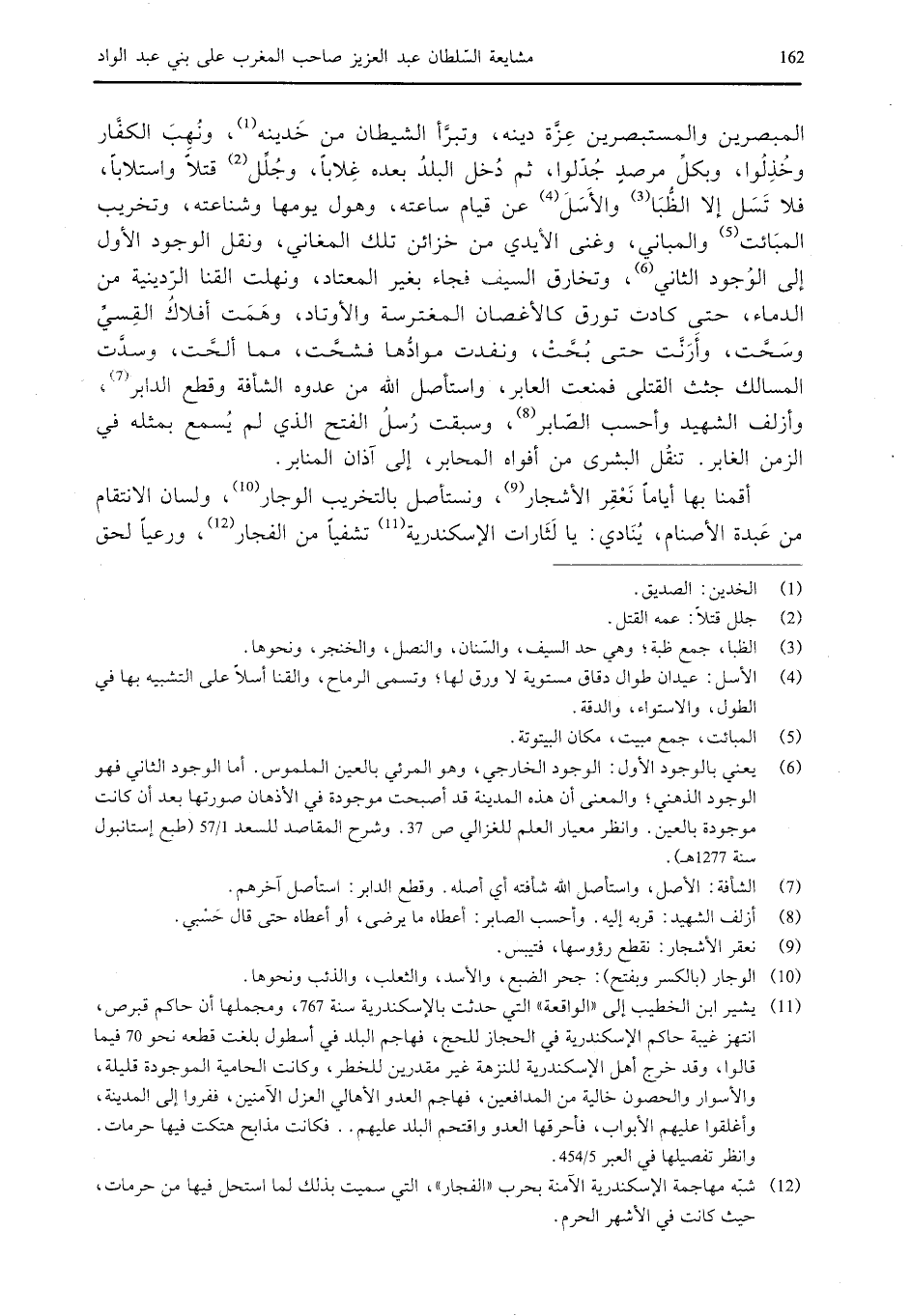الكفار وخذلوا، وبكل مرصد جدلوا، ثم دخل البلد بعده غلاباً، وجلل قتلاً واستلاباً، فلا تسل إلا الظبا والأسل عن قيام ساعته، وهول يومها وشناعته، وتخريب المبائت والمباني، وغنى الأيدي من خزائن تلك المغاني، ونقل الوجود الأول إلى الوجود الثاني، وتخارق السيف فجاء بغير المعتاد، ونهلت القنا الردينية من الدماء، حتى كادت تورق كالأغصان المغترسة والأوتاد، وهمت أفلاك القسي وسحت، وأرنت حتى بحت، ونفدت موادها فشحت، مما ألحت، وسدت المسالك جثث القتلى فمنعت العابر، واستأصل الله من عدوه الشأفة وقطع الدابر، وأزلف الشهيد وأحسب الصابر، وسبقت رسل الفتح الذي يسلم يسمع بمثله في الزمن الغابر. تنقل البشرى من أفواه المحابر، إلى آذان المنابر.