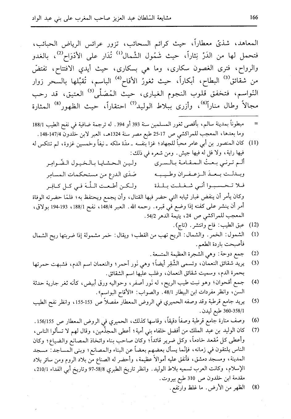 المعاهد، شذى معطاراً، حيث كرائم السحائب، تزور عرائس الرياض الحبائب، فتحمل لها من الدر نثاراً، حيث شمول الشمال تدار على الأدواح، بالغدو والرواح، فترى الغصون سكارى، وما هي بسكارى، حيث أيدي الافتتاح، تفتض من شقائق البطاح، أبكاراً، حيث ثغور الأقاح الباسم، تقبلها بالسحر زوار النواسم، فتخفق قلوب النجوم الغيارى، حيث المصلى العتيق، قد رحب مجالاً وطال مناراً، وأزرى ببلاط الوليد احتقاراً، حيث الظهور المثارة