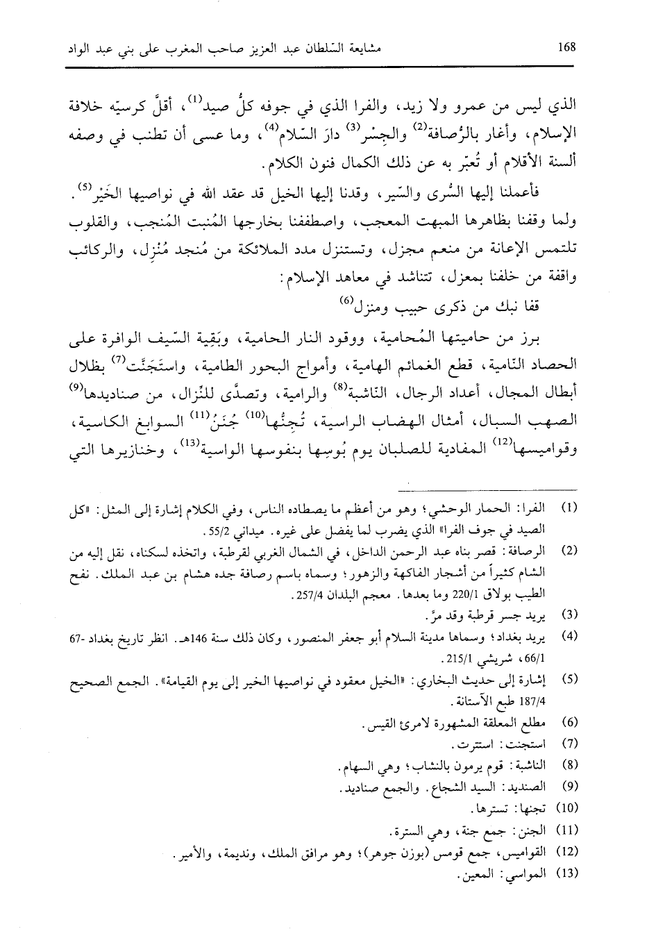 الذي ليس من عمرو ولا زيد، والفرا الذي في جوفه كل صيد، أقل كرسيه خلافة الإسلام، وأغار بالرصافة والجسر دار السلام، وما عسى أن تطنب في وصفه ألسنة الأقلام أو تعبر به عن ذلك الكمال فنون الكلام.