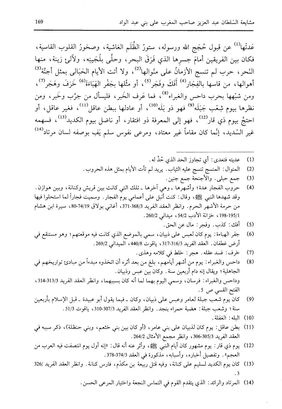 عدتها عن قبول حجج الله ورسوله، ستور الظلم الغاشية، وصخور القلوب القاسية، فكان بين الفريقين أمام جسرها الذي فرق البحر، وحلى بلجينه، ولآلئ زينه، منها النحر، حرب لم تنسج الأزمان على منوالها، ولا أتت الأيام الحبالى بمثل أجنة أهوالها، من قاسها بالفجار أفك وفجر، أو مثلها بجفر الهباءة خرف وهجر، ومن شبهها بحرب داحس والغبراء، فما عرف الخبر، فليسأل من جرب وخبر، ومن نظرها بيوم شعب جبله فهو ذو بله، أو عادلها ببطن عاقل، فغير عاقل، أو احتج بيوم ذي قار، فهو إلى المعرفة ذو افتقار، أو ناضل بيوم الكديد، فسهمه غير السديد، إنما كان مقاماً غير معتاد، ومرعى نفوس سلم يف بوصفه لسان مرتاد