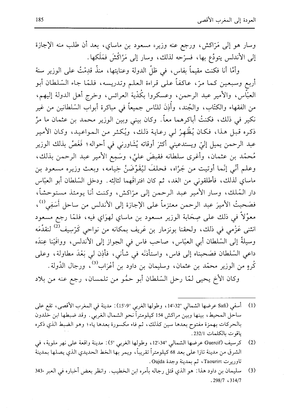وأما أنا فكنت مقيماً بفاس، في ظل الدولة وعنايتها، منذ ندمت على الوزير سنة ربع وسبعين كما مر، عاكفاً على قراءة العلم وتدريسه، فلما جاء السلطان أبو العباس، والأمير عبد الرحمن، وعسكروا بكدية العرائس، وخرج أهل الدولة إليهم، من الفقهاء والكتاب، والجند، وأذن للناس جميعاً في مباكرة أبواب السلطانين من غير نكير في ذلك، فكنت أباكرهما معاً. وكان بيني وبين الوزير محمد بن عثمان ما مر ذكره قبل هذا، فكان يظهر لي رعاية ذلك، ويكثر من المواعيد، وكان الأمير عبد الرحمن يميل إلي ويستدعيني أكثر أوقاته يشاورني في أحواله، فغص بذلك الوزير محمد بن عثمان، وأغرى سلطانه فقبض علي. وسمع الأمير عبد الرحمن بذلك، وعلم أني إنما أوتيت من جراه، فحلف ليقوضن خيامه، وبعث وزيره مسعود بن ماساي لذلك، فأطلقوني من الغد، ثم كان افتراقهما لثالثه. ودخل السلطان أبو العباس دار الملك، وسار الأمير عبد الرحمن إلى مراكش، وكنت أنا يومئذ مستوحشاً، فصحبت الأمير عبد الرحمن معتزماً على الإجازة إلى الأندلس من ساحل أسفي، معولاً في ذلك على صحابة الوزير مسعود بن ماساي لهواي فيه، فلما رجع مسعود انثنى عزمي في ذلك، ولحقنا بونزمار بن عريف بمكانه من نواحي كرسيف لنقدمه وسيلة إلى السلطان أبي العباس، صاحب فاس في