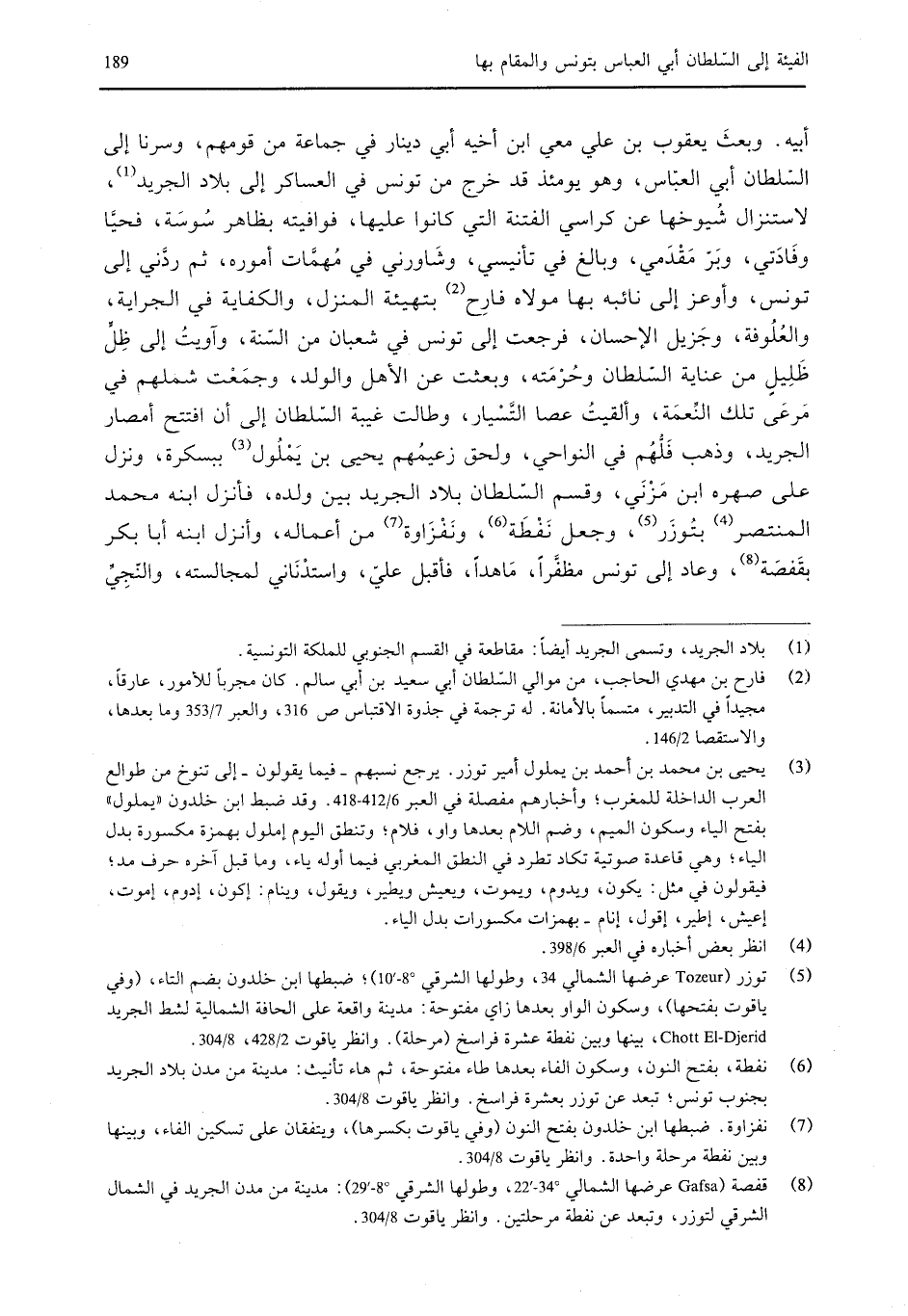 أبيه. وبعث يعقوب بن علي معي ابن أخيه أبي دينار في جماعة من قومهم، وسرنا إلى السلطان أبي العباس، وهو يومئذ قد خرج من تونس في العساكر إلى بلاد الجريد، لاستنزال شيوخها عن كراسي الفتنة التي كانوا عليها، فوافيته بظاهر سوسة، فحيا وفادتي، وبر مقدمي، وبالغ في تأنيسي، وشاورني في مهمات أموره، ثم ردني إلى تونس، وأوعز إلى نائبه بها مولاه فارح بتهيئة المنزل، والكفاية في الجراية، والعلوفة، وجزبل الإحسان، فرجعت إلى تونس في شعبان من السنة، وآويت إلى ظل ظليل من عناية السلطان وخرمته، وبعثت عن الأهل والولد، وجمعت شملهم في مرعى تلك النعمة، وألقيت عصا التسيار، وطالت غيبة السلطان إلى أن افتتح أمصار الجريد، وذهب فلهم في النواحي، ولحق زعيمهم يحيى بن يملول ببسكرة، ونزل على صهره ابن مزني،