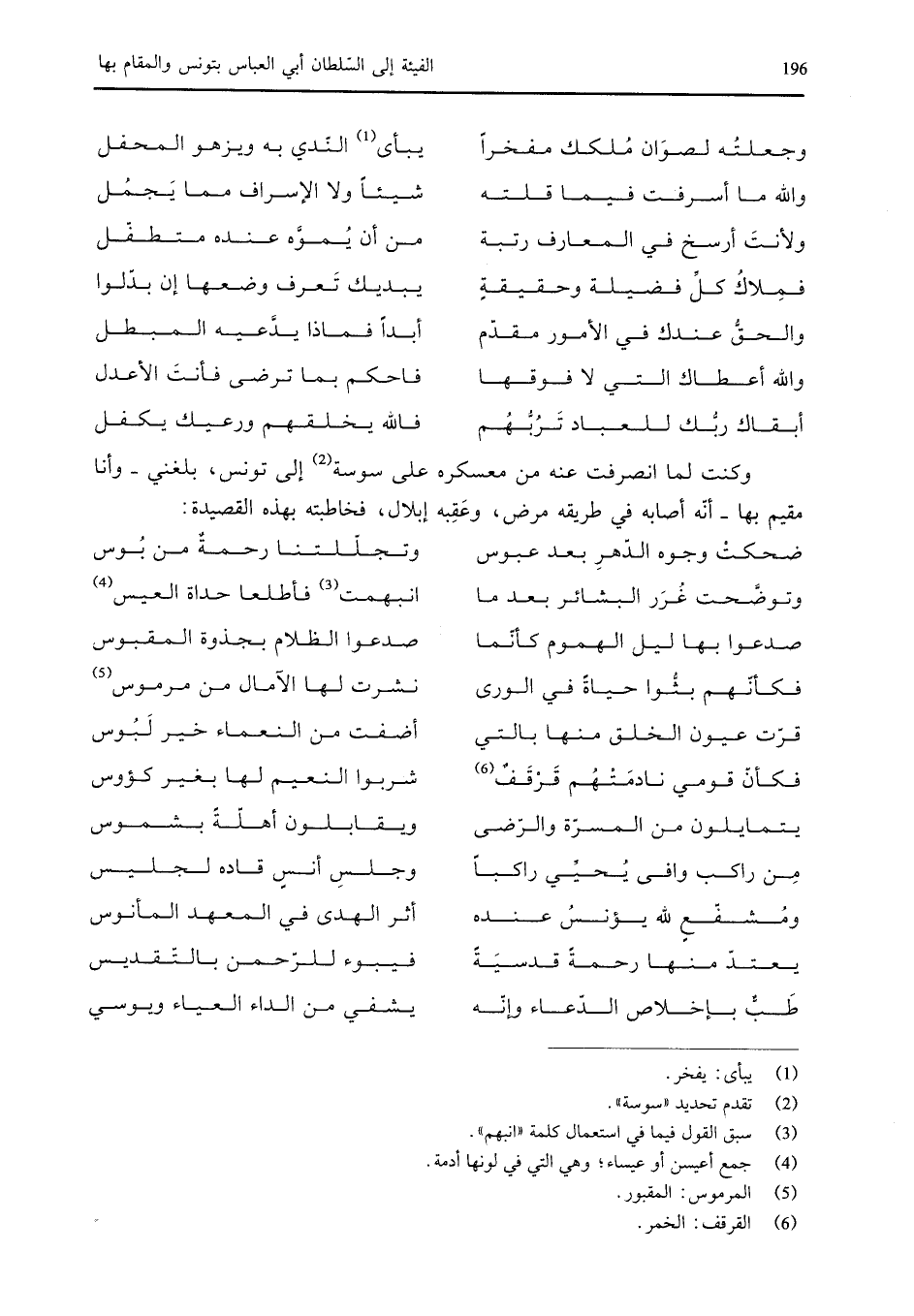 وكنت لما انصرفت عنه من معسكره على سوسة إلى تونس، بلغني - وأنا مقيم بها - أنه أصابه في طريقه مرض، وعقبه إبلال، فخاطبته بهذه القصيدة: