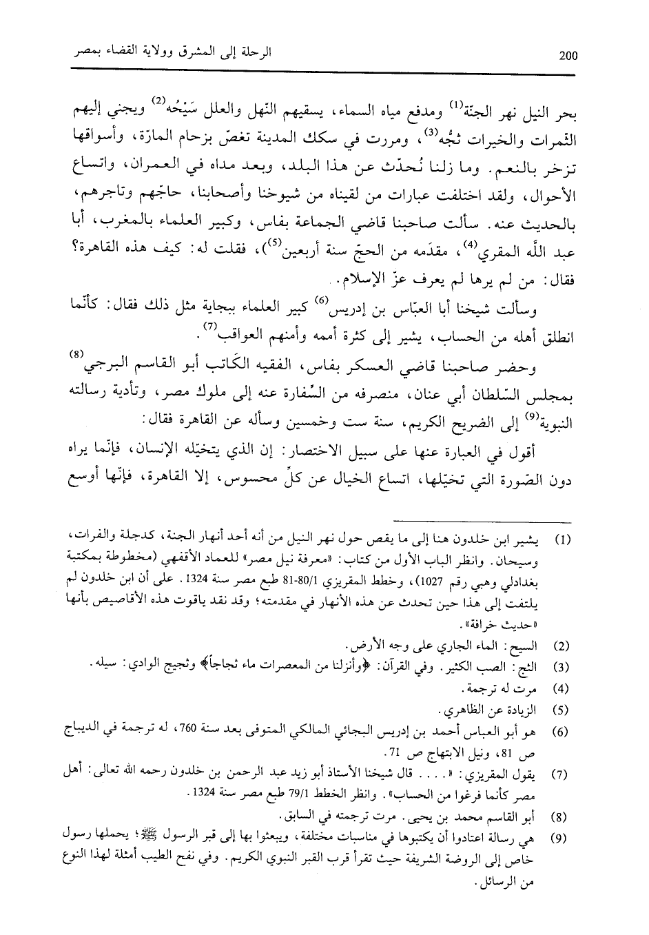بحر النيل نهر الجنة ومدفع مياه السماء، يسقيهم النهل والعلل سيحه ويجني إليهم الثمرات والخيرات ثجه، ومررت في سكك المدينة تغص بزحام المارة، وأسواقها تزخر بالنعم. وما زلنا نحدث عن هذا البلد، وبعد مداه في العمران، واتساع الأحوال، ولقد اختلفت عبارات من لقيناه من شيوخنا وأصحابنا، حاجهم وتاجرهم، بالحديث عنه. سألت صاحبنا قاضي الجماعة بفاس، وكبير العلماء بالمغرب، أبا عبد الله المقري، (مقدمه من الحج سنة أربعين)، فقلت له: كيف هذه القاهرة؟ فقال: من لم يرها لم يعرف عز الإسلام.