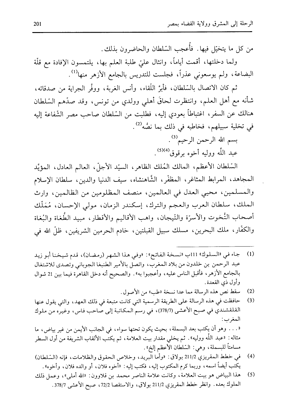 ثم كان الاتصال بالسلطان، فأبر اللقاء، وأنس الغربة، ووفر الجراية من صدقاته، شأنه مع أهل العلم، وانتظرت لحاق أهلي وولدي من تونس، وقد صدهم السلطان هنالك عن السفر، اغتباطاً بعودي إليه، فطلبت من السلطان صاحب مصر الشفاعة إليه في تخلية سبيلهم، فخاطبه في ذلك بما نصه.