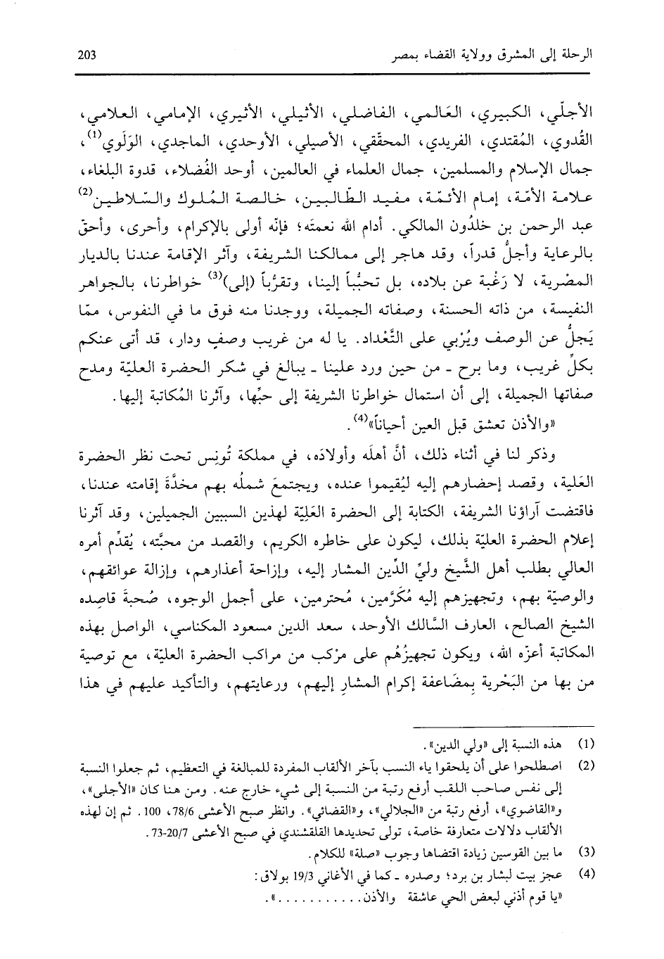 الأجلي، الكبيري، العالمي، الفاضلي، الأثيلي، الأثيري، الإمامي، العلامي القدوة، المقتدي، الفريدي، المحققي، الأصيلي، الأوحدي، الماجدي، الولوي، جمال الإسلام والمسلمين جمال العلماء في العالمين، أوحد الفضلاء، قدوة البلغاء، علامة الأمة، إمام الأئمة، مفيد الطالبين، خالصة الملوك والسلاطين عبد الرحمن بن خلدون المالكي. أدام الله نعمته، فإنه أولى بالإكرام، وأحرى، وأحق بالرعاية وأجل قدراً، وقد هاجر إلى ممالكنا الشريفة، وآثر الإقامة عندنا بالديار المصرية، لا رعبة عن بلاده، بل تحبباً إلينا، وتقرباً إلى خواطرنا، بالجواهر النفيسة، من ذاته الحسنة، وصفاته الجميلة، ووجدنا منه فوق ما في