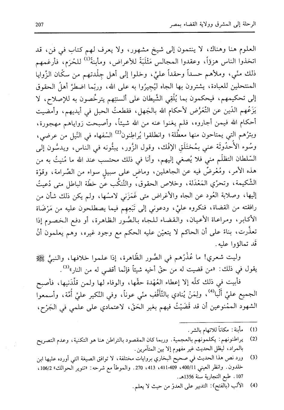 العلوم هنا وهناك، لا ينتمون إلى شيخ مشهور، ولا يعرف لهم كتاب في فن، قد اتخذوا الناس هزؤاً، وعقدوا المجالس مثلبة للأعراض، ومأبنة للحرم، فأرغمهم ذلك مني، وملأهم حسداً وحقداً علي، وخلوا إلى أهل جلدتهم من سكان الزوايا المنتحلين للعبادة، يشترون بها الجاه ليجيروا به على الله، وربما اضطر أهل الحقوق إلى تحكيمهم، فيحكمون بما يلقي الشيطان على ألسنتهم يترخصون به للإصلاح، لا يزعهم الدين عن التعرض لأحكام الله بالجهل، فقطعت الحبل في أيديهم، وأمضيت أحكام الله فيمن أجاروه، فلم يغنوا عنه من الله شيئاً، وأصبحت زواياهم مهجورة، وبئرهم التي يمتاحون منها معطلة. وانطلقوا يراطنون السفهاء في النيل من عرضي، وسوء الأحدوثة عني بمختلق الإفك، وقول الزور، يبثونه في الناس، ويدسون إلى السلطان التظلم مني فلا يصغي إليهم، وأنا في ذلك محتسب عند الله ما فنيت به من هذا الأمر، ومعرض فيه عن الجاهلين، وماض على سبيل سواء من الصرامة، وقوة الشكيمة، وتحري المعدلة، وخلاص الحقوق، والتنكب عن خطة الباطل متى دعيت إليها، وصلابة العود عن الجاه والأغراض متى غمزني لامسها، ولم يكن ذلك شأن من رافقته من القضاة، فنكروه علي، ودعوني إلى تبعهم فيما يصطلحون عليه من مرضاة الأكابر، ومراعاة الأعيان، والقضاء للجاه بالصور الظاهرة، أو دفع الخصوم إذا تعذرت، بناء على أن الحاكم لا يتعين عليه الحكم مع وجود غيره، وهم يعملون أن قد تمالأوا عليه.