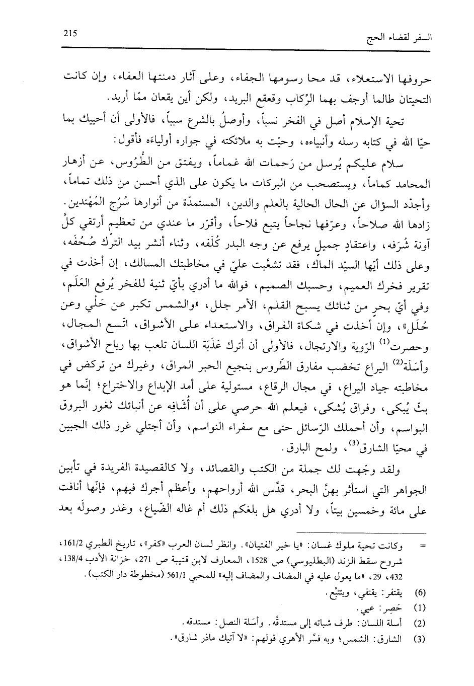 السؤال عن الحال الحالية بالعلم والدين، المستمدة من أنوارها سرج المهتدين. زادها الله صلاحاً، وعرفها نجاحاً يتبع فلاحاً، وأقرر ما عندي من تعظيم أرتقي كل آونة شرفه، واعتقاد جميل يرفع عن وجه البدر كلفه، وثناء انشر بيد الترك صحافه، وعلى ذلك أيها السيد المالك، فقد تشعبت علي في مخاطبتك المسالك، إن أخذت في تقرير فخرك العميم، وحسبك الصميم، فو الله ما أدري بأي ثنية للفخر يرفع العلم، وفي أي بحر من ثنائك يسبح القلم، الأمر جلل، والشمس تكبر عن حلي وعن حلل، وإن أخذت في شكاة الفراق، والاستعداء على الأشواق، اتسع المجال، وحصرت الروية والارتجال، فالأولى أن أترك عذبة اللسان تلعب بها رياح الأشواق، وأسلة اليراع تخضب مفارق الطروس بنجيع الحبر المراق، وغيرك من تركض في مخاطبته جياد اليراع، في مجال الرقاع، مستولية على أمد الإبداع والاختراع، إنما هو بث يبكى، وفراق يشكى، فيعلم الله حرصي على أن أشافه عن أنبائك ثغور البروق البواسم، وأن أحملك الرسائل حتى مع سفراء النواسم، وأن أجتلي غرر ذلك الجبين في محيا الشارق، ولمح البارق.