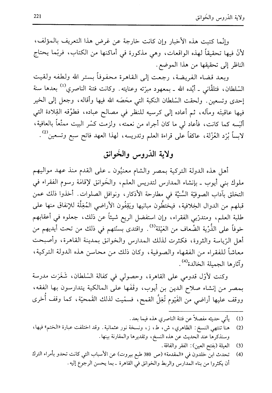 أهل هذه الدولة التركية بمصر والشام معنيون - على القدم منذ عهد مواليهم ملوك بني أيوب - بإنشاء المدارس لتدريس العلم، والخوانق لإقامة رسوم الفقراء في التخلق بآداب الصوفية السنية في مطارحة الأذكار، ونوافل الصلوات. أخذوا ذلك عمن قبلهم من الدوال الخلافية، فيختطون مبانيها ويقفون الأراضي المغلة للإنفاق منها على طلبة العلم، ومتدربي الفقراء. وإن استفضل الريع شيئاً عن ذلك، جعلوه في أعقابهم خوفاً على الذرية الضعاف من العيلة. واقتدى بسنتهم في ذلك من تحت أيديهم من أهل الرياسة والثروة، فكثرت لذلك المدارس والخوانق بمدينة القاهرة، وأصبحت معاشاً للفقراء من الفقهاء والصوفية، وكان ذلك من محاسن هذه الدولة التركية، وآثارها الجميلة الخالدة.