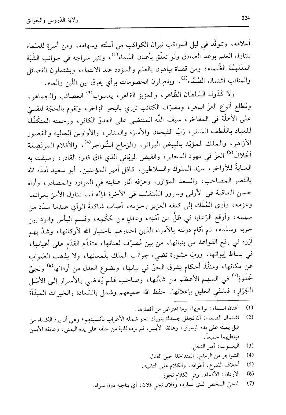 أعلامه، وتتوقد في ليل المواكب نيران الكواكب من أسنته وسهامه، ومن أسرة للعلماء نتناول العلم بوعد الصادق ولو تعلق بأعنان السماء، وتنير سراجه في جوانب الشبه المدلهمة الظلماء، ومن قضاة يباهون بالعلم والسؤدد عند الانتماء، ويشتملون الفضائل