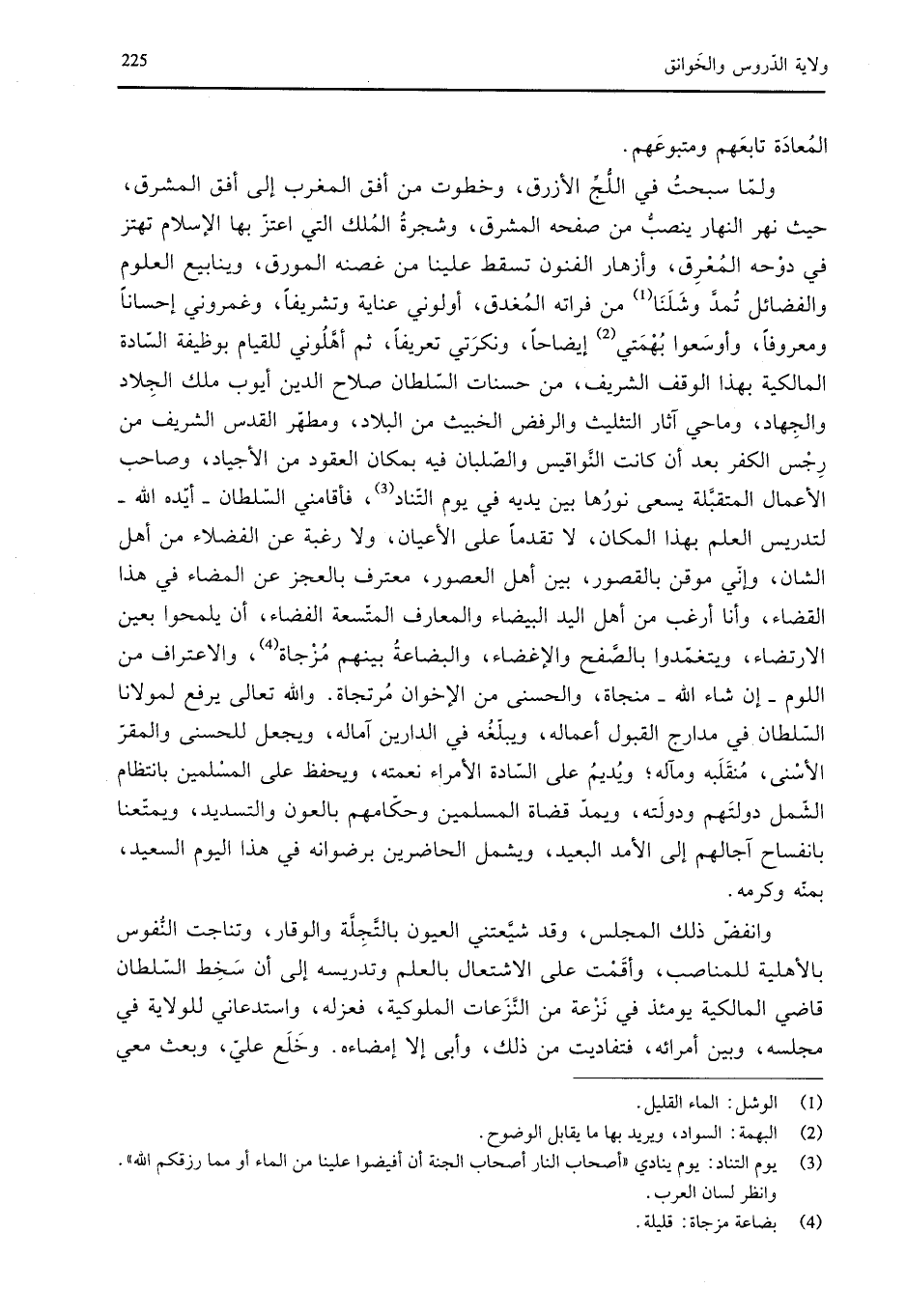والفضائل تمد وشلنا من فراته المغدق، أولوني عناية وتشريفاً، وغمروني إحساناً ومعروفاً، وأوسعوا بهمتي إيضاحاً، ونكرتي تعريفاً، ثم أهلوني للقيام بوظيفة السادة المالكية بهذا الوقف الشريف، من حسنات السلطان صلاح الدين أيوب ملك الجلاد والجهاد، وماحي آثار التثليث والرفض الخبيث من البلاد، ومطهر القدس الشريف من رجس الكفر بعد أن كانت النواقيس والصلبان فيه بمكان العقود من الأجياد. وصاحب الأعمال المتقبلة يسعى نورها بين يديه في يوم التناد، فأقامني السلطان - أيده الله - لتدريس العلم بهذا المكان، لا تقدما على الأعيان، ولا رغبة عن الفضلاء من أهل الشان، وإني موقن بالقصور، بين أهل العصور، معترف بالعجز عن المضاء في هذا القضاء، وأنا أرغب من أهل اليد البيضاء والمعارف المتسعة الفضاء، أن يلمحوا بعين الارتضاء، ويتغمدوا بالصفح والاغضاء، والبضاعة بينهم مزجاة، والاعتراف من اللوم - إن شاء الله - منجاة، والحسنى من الإخوان مرتجاة. والله تعالى يرفع لمولانا السلطان في مدارج القبول أعماله، ويبلغه في الدارين آماله، ويجعل للحسنى والمقر الأسنى، منقلبه ومآله، ويديم على السادة الأمراء نعمته، ويحفظ على المسلمين بانتظام الشمل دولتهم ودولته، ويمد قضاة المسلمين وحكامهم بالعون والتسديد، ويمتعنا بانفساح آجالهم إلى الأمد البعيد، ويشمل الحاضرين برضوانه في هذا اليوم السعيد، بمنه وكرمه.