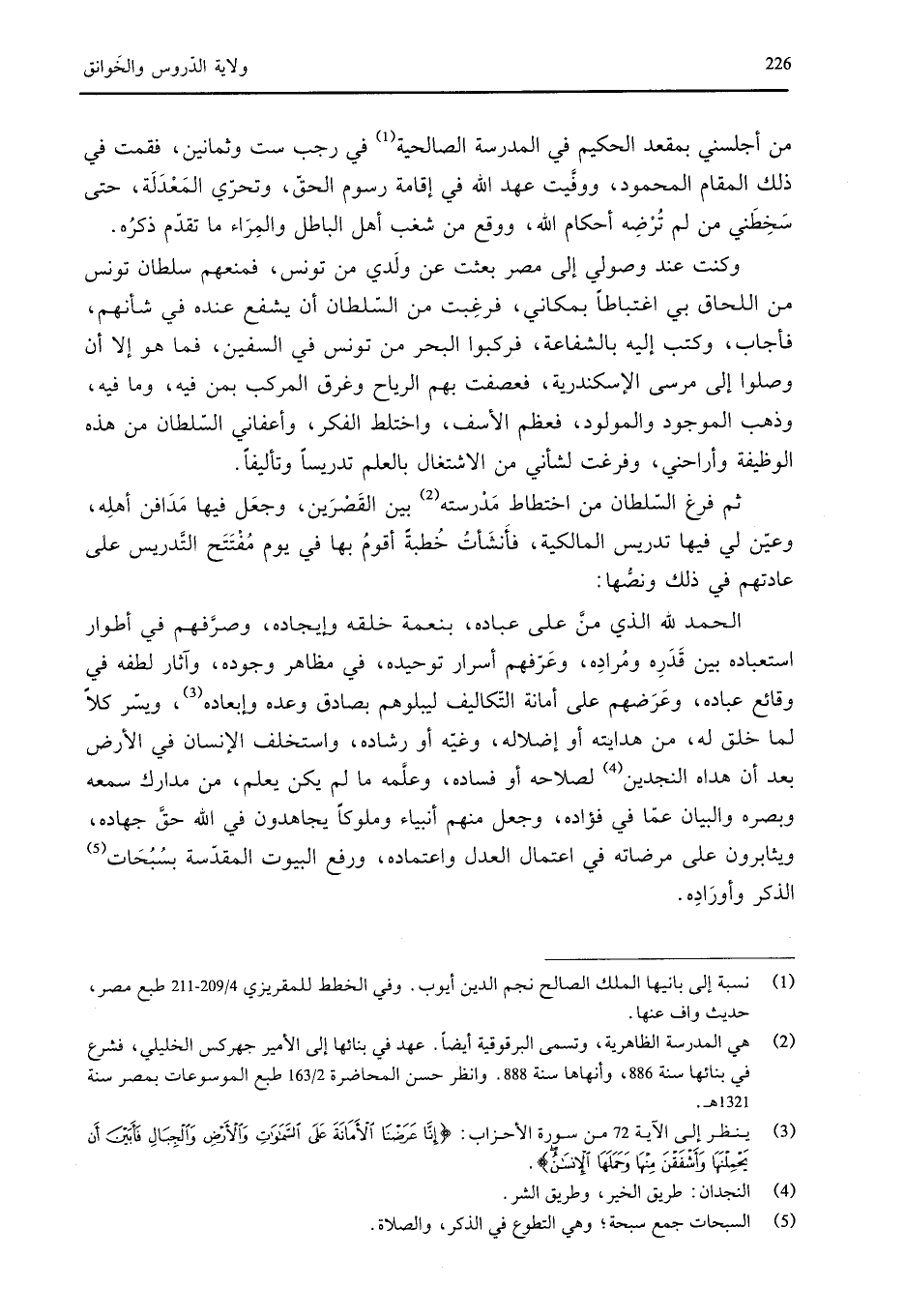ثم فرغ السلطان من اختطاط مدرسته بين القصرين، وجعل فيها مدافن أهله، وعين لي فيها تدريس المالكية، فأنشأت خطبة أقوم بها في يوم مفتتح التدريس على عادتهم في ذلك ونصها: