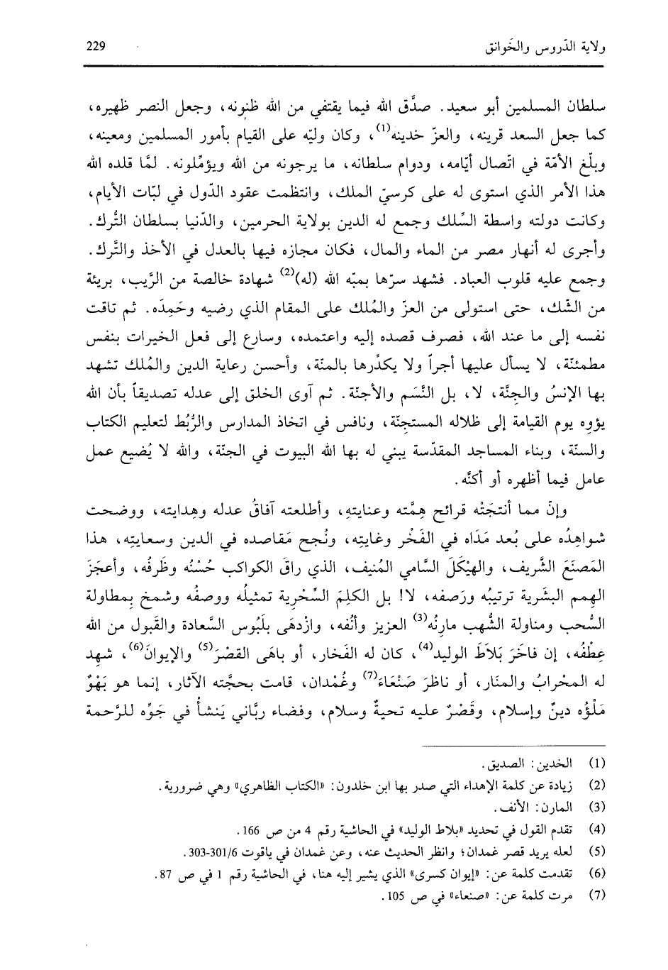 فصرف قصده إليه واعتمده، وسارع إلى فعل الخيرات بنفس مطمئنة، لا يسأل عليها أجراً ولا يكدرها بالمنة، وأحسن رعاية الدين والملك تشهد بها الإنس والجنة، لا، بل النسم والأجنة. ثم آوى الخلق إلى عدله تصديقاً بأن الله يؤوه يوم القيامة إلى ظلاله المستجنة، ونافس في اتخاذ المدارس والربط لتعليم الكتاب والسنة، وبناء المساجد المقدسة يبني له بها الله البيوت في الجنة، والله لا يضيع عمل عامل فيما أظهره أو أكنه.