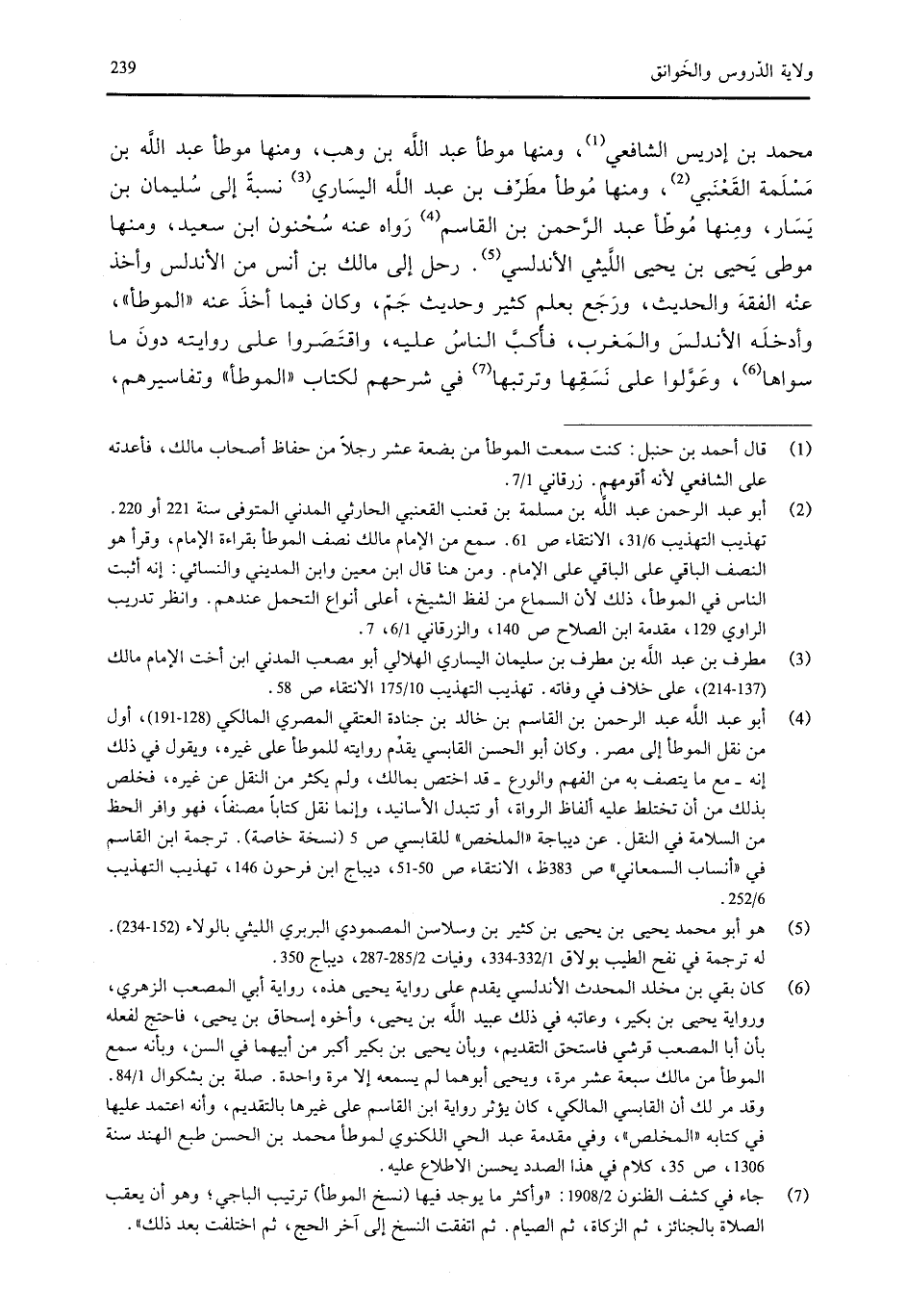 محمد بن إدريس الشافعي، ومنها موطأ عبد الله بن وهب، ومنها موطأ عبد الله بن مسلمة القعنبي، ومنها موطأ مطرف بن عبد الله اليساري نسبة إلى سليمان بن يسار، ومنها موطأ عبد الرحمن بن القاسم رواه عنه سحنون بن سعيد، ومنها موطأ يحيى بن يحيى الأندلسي. رحل إلى مالك بن أنس من الأندلس وأخذ عنه الفقه والحديث، ورجع بعلم كثير وحديث جم، وكان فيما أخذ عنه الموطأ، وأدخله الأندلس والمغرب، فأكب الناس عليه، واقتصروا على روايته دون ما سواها، وعولوا على نسقها وترتيبها في شرحهم لكتاب الموطأ وتفاسيرهم،