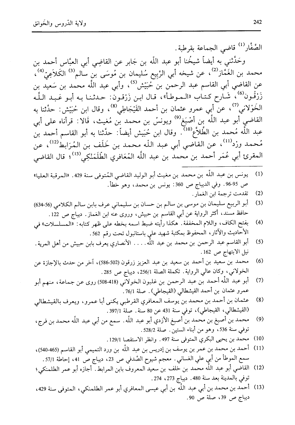 القاضي أبي عبد الله محمد ابن خلف بن المرابط، عن المقرئ أبي عمر أحمد بن محمد بن عبد الله المعافري الطلمنكي، قال القاضي