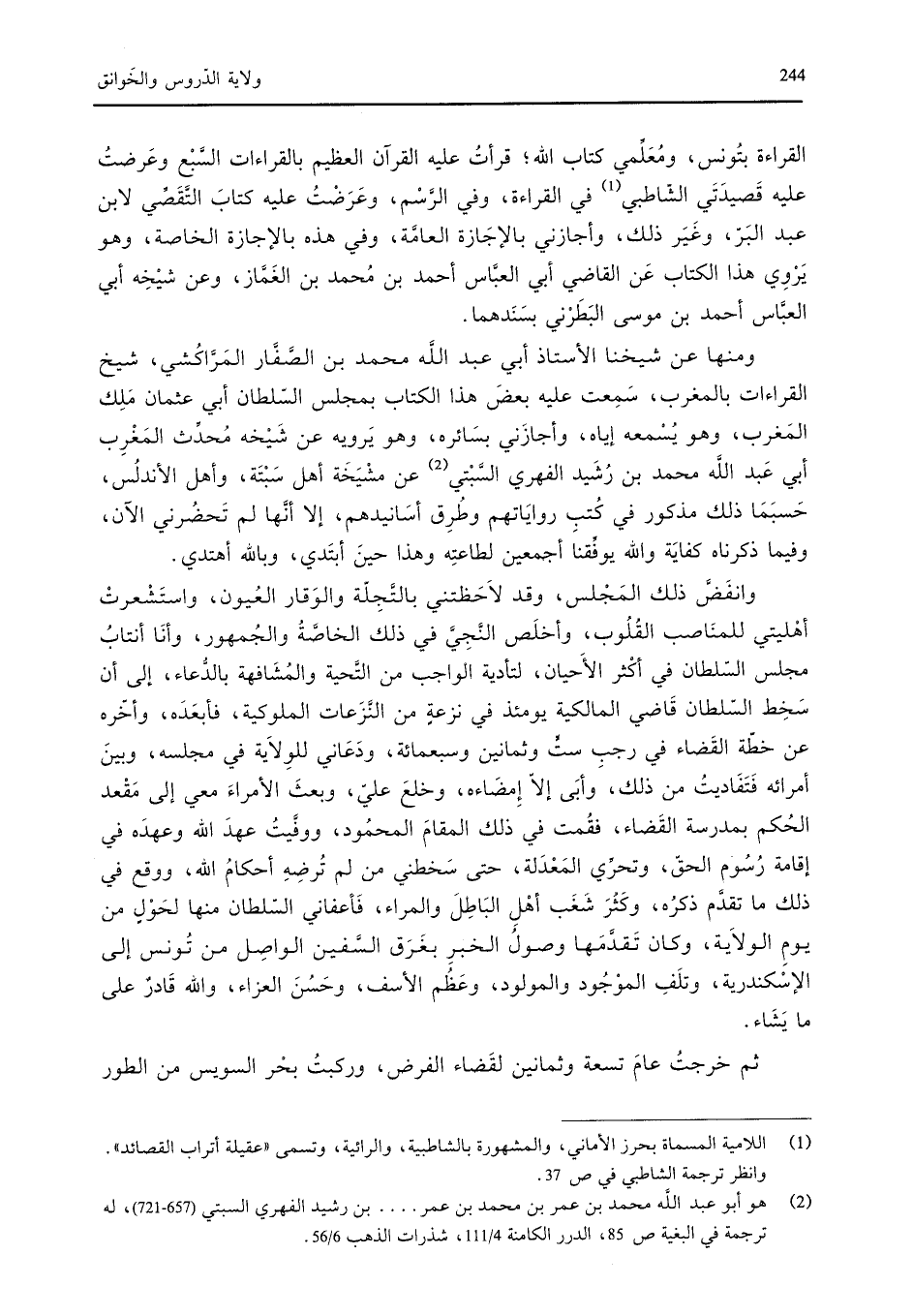 وانفض ذلك المجلس، وقد لاحظتني بالتجلة والوقار العيون، واستشعرت أهليتي للمناصب القلوب، وأخلص النجي في ذلك الخاصة والجمهور، وأنا أنتاب مجلس السلطان في أكثر الأحيان، لتأدية الواجب من التحية والمشافهة بالدعاء، إلى أن سخط السلطان قاضي المالكية يومئذ في نزعة من النزعات الملوكية، فأبعده، وأخره عن خطة القصاء في رجب ست وثمانين وسبعمائة، ودعاني للولاية في مجلسه، وبين أمرائه فتفاديت من ذلك، وأبى إلا إمضاءه، وخلع علي، وبعث الأمراء معي إلى مقعد الحكم بمدرسة القضاء، فقمت في ذلك المقام المحمود، ووفيت عهد الله وعهده في إقامة رسوم الحق، وتحري المعدلة، حتى سخطني من لم ترضه أحكام الله، ووقع في ذلك ما تقدم ذكره، وكثر شغب أهل الباطل والمراء، فأعفاني السلطان منها لحول من يوم الولاية، وكان تقدمها وصول الخبر بغرق السفين الواصل من تونس إلى الإسكندرية، وتلف الموجود والمولود، وعظم