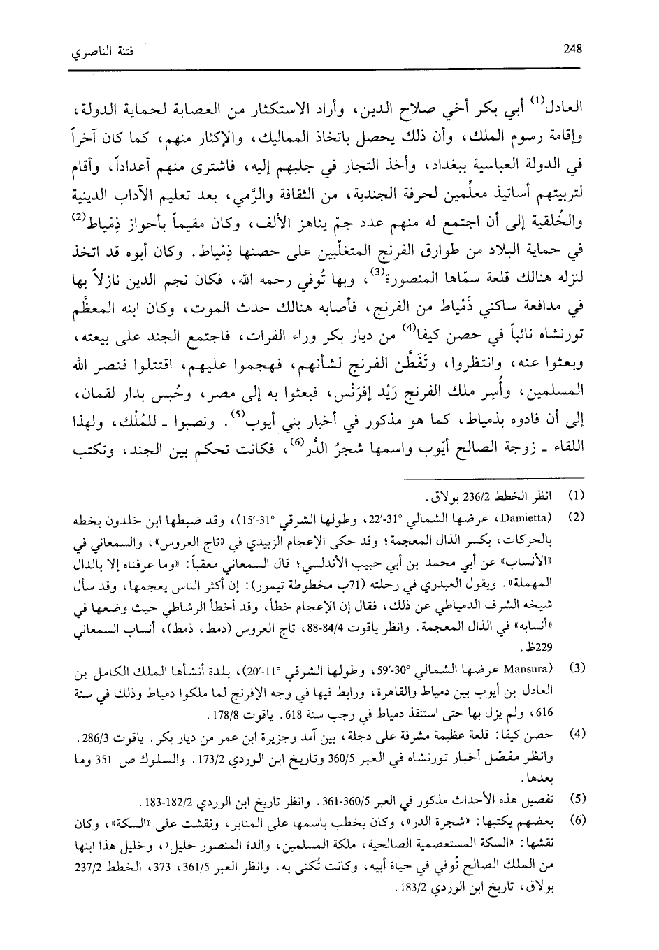 المسلمين، وأسر ملك الفرنج ريد إفرنس، فبعثوا به إلى مصر. وحبس بدار لقمان، إلى أن فادوه بدمياط، كما هو مذكور في أخبار بني أيوب. ونصبوا - للملك، ولهذا اللقاء - زوجة الصالح أيوب واسمها شجرة الدر، فكانت تحكم بين الجند، وتكتب