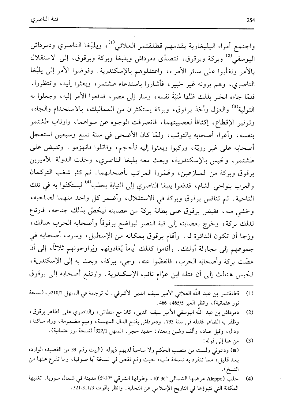 بأصحابهما. ثم كثر شغب التركمان والعرب بنواحي الشام، فدفعوا يلبغا الناصري إلى النيابة بحلب ليستكفوا به في تلك الناحية. ثم تنافس برقوق وبركة في الاستقلال، واضمر كل واحد منهما لصاحبه، وخشي معه، فقبض برقوق على بطانة بركة من عصابته ليحض بذلك جناحه، فارتاع لذلك بركة، وخرج بعصابته إلى قبة النصر ليواضع برقوقاً وأصحابه الحرب هنالك، ورجا أن تكون الدائرة له. وأقام برقوق بمكانه من الإسطبل، وسرب أصحابه في جموعهم إلى مجاولة أولئك. وأقاموا كذلك أياماً يغادونهم ويراوحونهم ثلاثاً، إلى أن عضت بركة وأصحابه الحرب، فانفضوا عنه، وجيء ببركة، وبعث به إلى الإسكندرية، فحبس هنالك إلى أن قتله ابن عرام نائب الإسكندرية. وارتفع أصحابه إلى برقوق