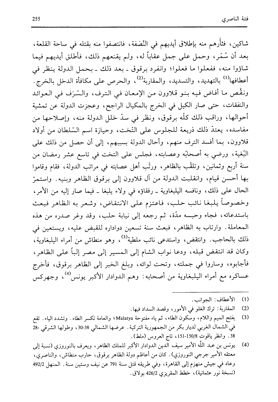 شاكين، فثارهم منه بإطلاق أيديهم في النصفة، فانتصفوا منه بقتله في ساحة القلعة، بعد أن سمر، وحمل على جمل عقاباً له، ولم يقنعهم ذلك، فأطلق أيديهم فيما شاءوا منه، ففعلوا مما فعلوا. وانفرد برقوق - بعد ذلك - بحمل الدولة ينظر في أعطافها بالتهديد، والتسديد، والمقاربة، والحرص على مكافأة الدخل بالخرج. ونقص ما أفاض فيه بنو قلاوون من الإمعان في الترف، والسرف في العوائد والنفقات، حتى صار الكيل في الخرج بالمكيال الراجح، وعجزت الدولة عن تمشية أحوالها، وراقب ذلك كله برقوق، ونظر في سد خلل الدولة منه، وإصلاحها من مفاسده، يعتد ذلك ذريعة للجلوس على التخت، وحيازة اسم السلطان من أولاد قلاوون، بما أفسد الترف منهم، وأحال الدولة بسببهم، إلى أن حصل من ذلك على البغية، ورضي به أصحابه وعصابته، فجلس على التخت في تاسع عشر رمضان من سنة أربع وثمانين، وتلقب بالظاهر. ورتب أهل عصابته في مراتب الدولة، فقام وقاموا بها أحسن قيام، وانقلبت الدولة من آل قلاوون إلى برقوق الظاهر وبنيه. واستمر الحال على ذلك، ونافسه اليلبغاوية - رفقاؤه في ولاء يلبغا - فيما