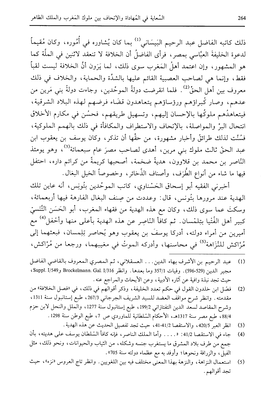 الملة كما هو المشهور، وإن اعتمد أهل المغرب سوى ذلك، لما يرون أن الخلافة ليست لقباً فقط، وإنما هي لصاحب العصبية القائم عليها بالشدة والحماية، والخلاف في ذلك معروف بين أهل الحق. فلما انقرضت دولة الموحدين، وجاءت دولة بني مرين من بعدهم، وصار كبراؤهم ورؤساؤهم يتعاهدون قضاء فرضهم لهذه البلاد الشرقية، فيتعاهدهم ملوكها بالإحسان إليهم، وتسهيل طريقهم، فحسن في مكارم الأخلاق انتحال البر والمواصلة، بالإتحاف والاستطراف والمكافأة في ذلك بالهمم الملوكية، فسنت لذلك طرائق وأخبار مشهورة، من حقها أن تذكر، وكان يوسف بن يعقوب بن عبد الحق ثالث ملوك بني مرين، أهدى لصاحب مصر عام سبعمائة، وهو يومئذ الناصر بن محمد بن قلاوون، هدية ضخمة، أصحبها كريمة من كرائم داره، احتفل فيها ما شاء من أنواع الطرف، وأصناف الذخائر، وخصوصاً الخيل والبغال.