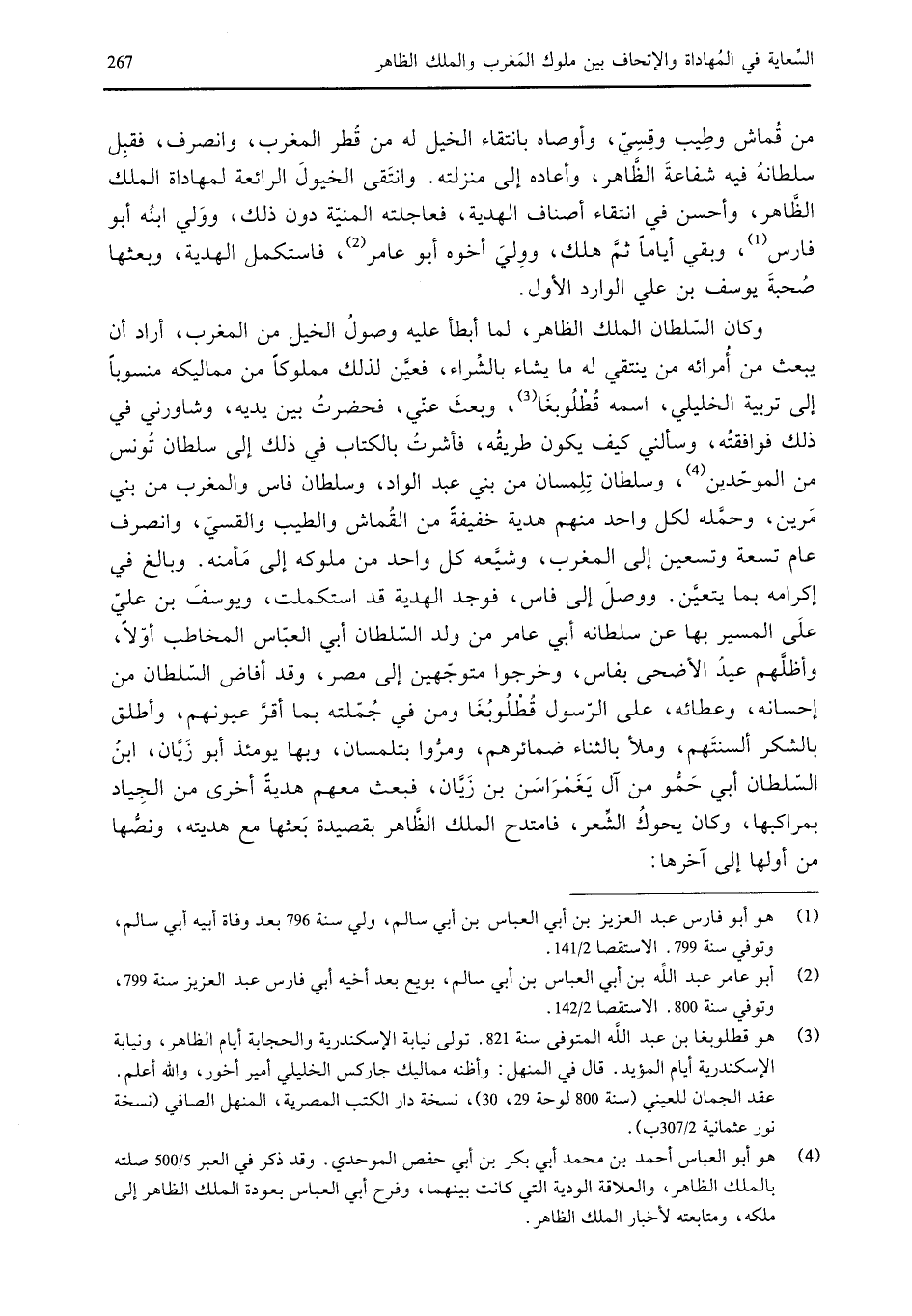 من قماش وطيب وقسي، وأوصاه بانتقاء الخيل له من قطر المغرب، وانصرف، فقبل سلطانه فيه شفاعة الظاهر، وأعاده إلى منزلته. وانتقى الخيول الرائعة لمهاداة الملك الظاهرة وأحسن في انتقاء أصناف الهدية، فعاجلته المنية دون ذلك، وولي ابنه أبو فارس، وبقي أياماً ثم هلك، وولى أخوه أبو عامر،