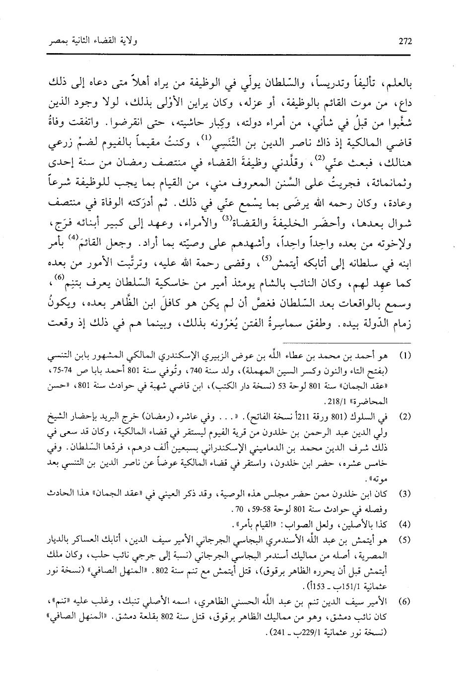 بالعلم، تأليفاً وتدريساً، والسلطان يولي في الوظيفة من يراه أهلاً متى دعاه إلى ذلك داع، من موت القائم بالوظيفة، أو عزله، وكان يراني الأولى بذلك، لولا وجود الذين شغبوا من قبل في شأني، من أمراء دولته، وكبار حاشيته، حتى انقرضوا. واتفقت وفاة قاضي المالكية إذ ذاك ناصر الدين بن التنسي، وكنت مقيماً بالفيوم لضم زرعي هنالك، فبعث عني، وقلدني وظيفة القضاء في منتصف رمضان من سنة إحدى وثمانمائة، فجريت على السنن المعروف مني، من القيام بما يجب للوظيفة شرعاً وعادة، وكان رحمه الله يرضى بما يسمع عني في ذلك. ثم أدركته الوفاة في منتصف شوال بعدها، وأحضر الخليفة والقضاة والأمراء، وعهد إلى كبير أبنائه فرج، ولإخوته من بعده واحداً واحداً، وأشهدهم على وصيته بما أراد. وجعل القائم بأمر ابنه في سلطانه إلى أتابكه أيتمش، وقضى رحمة الله عليه، وترتبت الأمور من بعده كما عهد لهم، وكان النائب بالشام يومئذ أمير من خاسكية السلطان يعرف بتنم، وسمع بالواقعات بعد السلطان فغص أن لم يكن هو كافل ابن الظاهر بعده، ويكون زمام الدولة بيده. وطفق سماسرة الفتن يغرونه بذلك، وبينما هم في ذلك إذ وقعت