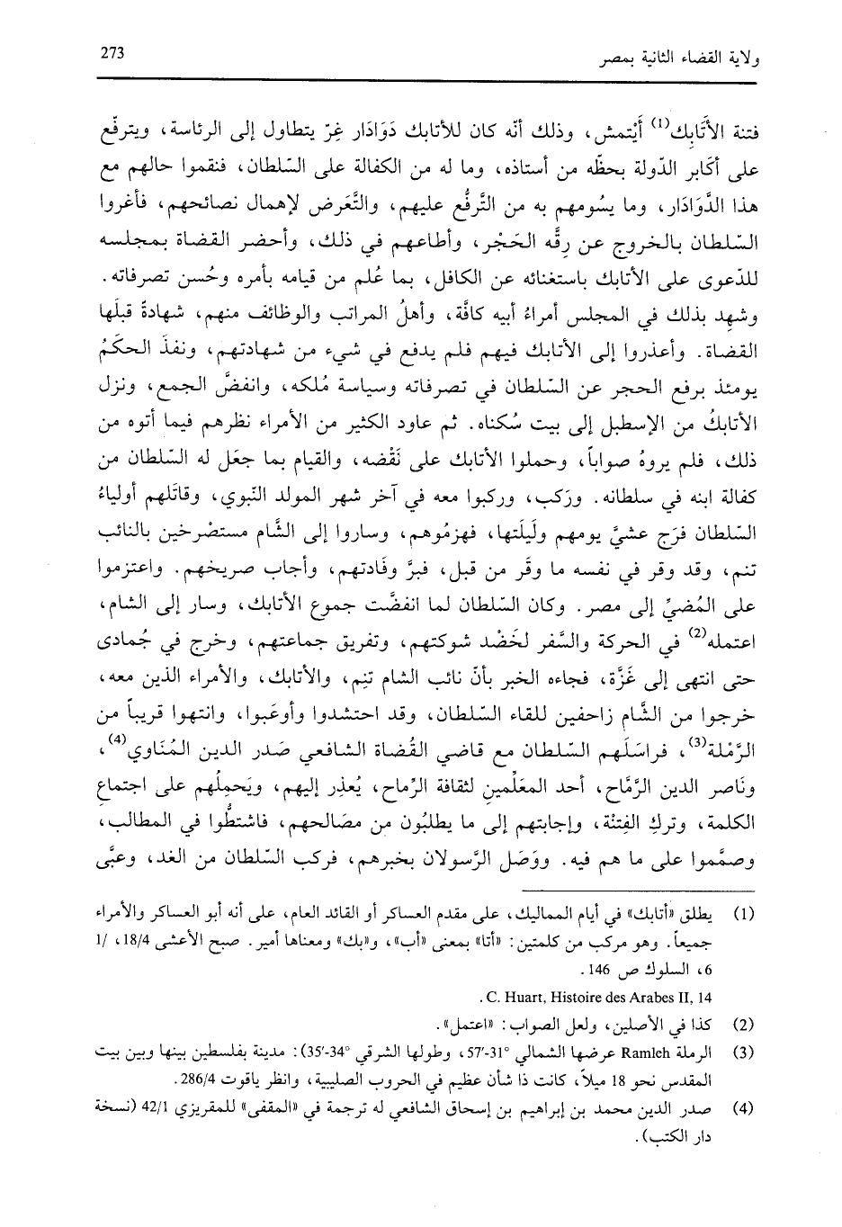 فتنة الأتابك أيتمش، وذلك أنه كان للأتابك دوادار غر يتطاول إلى الرئاسة، ويترفع على أكابر الدولة بحظه من أستاذه، وما له من الكفالة على السلطان، فنقموا حالهم مع هذا الدوادار، وما يسومهم به من الترفع عليهم، والتعرض لإهمال نصائحهم، فأغروا السلطان بالخروج عن ربقه الحجر، وأطاعهم في ذلك، وأحضر القضاة بمجلسه للدعوى على الأتابك باستغنائه عن الكافل، بما علم من قيامه بأمره وحسن تصرفاته. وشهد بذلك في المجلس أمراء أبيه كافة، وأهل المراتب والوظائف منهم، شهادة قبلها القضاة. وأعذروا إلى الأتابك فيهم فلم يدفع في شيء من شهادتهم، ونفذ الحكم يومئذ برفع الحجر عن