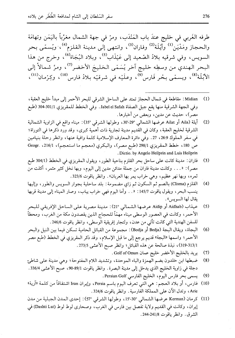 طرفه الغربي في خليج عند باب المندب، ومر في جهة الشمال مغرباً باليمن وتهامة والحجاز ومدين وأيلة وفاران، وانتهى إلى مدينة القلزم، ويسمى بحر السويس، وفي شرقيه بلاد الصعيد إلى عيذاب، وبلا البجاة، وخرج من هذا البحر الهندي من وسطه خليج آخر يسمى الخليج الأخضر، ومر شمالاً إلى الأبلة، ويسمى بحر فارس، وعليه في شرقيه بلاد فارس، وكرمان،
