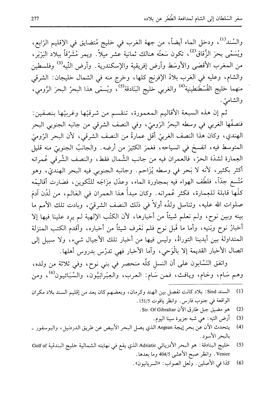 والسند، ودخل الماء أيضاً، من جهة الغرب في خليج متضايق في الإقليم الرابع، ويسمى بحر الزقاق، تكون سعته هنالك ثمانية عشر ميلاً. ويمر مشرقاً ببلاد البربر، من المغرب الأقصى والأوسط وأرض إفريقية والإسكندرية. وأرض التيه وفلسطين والشام، وعليه في الغرب بلاد الإفرنج كلها، وخرج منه في الشمال