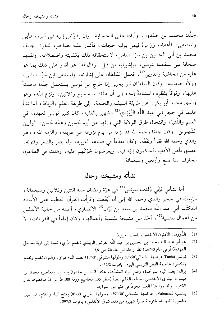 أما نشأتي فإني وُلدت بتونس في غرة رمضان سنة اثنتين وثلاثين وسبعمائة، وربيت في حجر والدي رحمه الله إلى أن أَيْفَعت وقرأْت القرآن العظيم على الأُستاذ المكتِّب أبي عبد الله محمد بن سعد بن بُرَّال الأنصاري، أصله من جالية الأندلس من أعمال بلنسية، أخذ عن مشيخة بلنسية وأعمالها، وكان إماماً في القراءات، لا