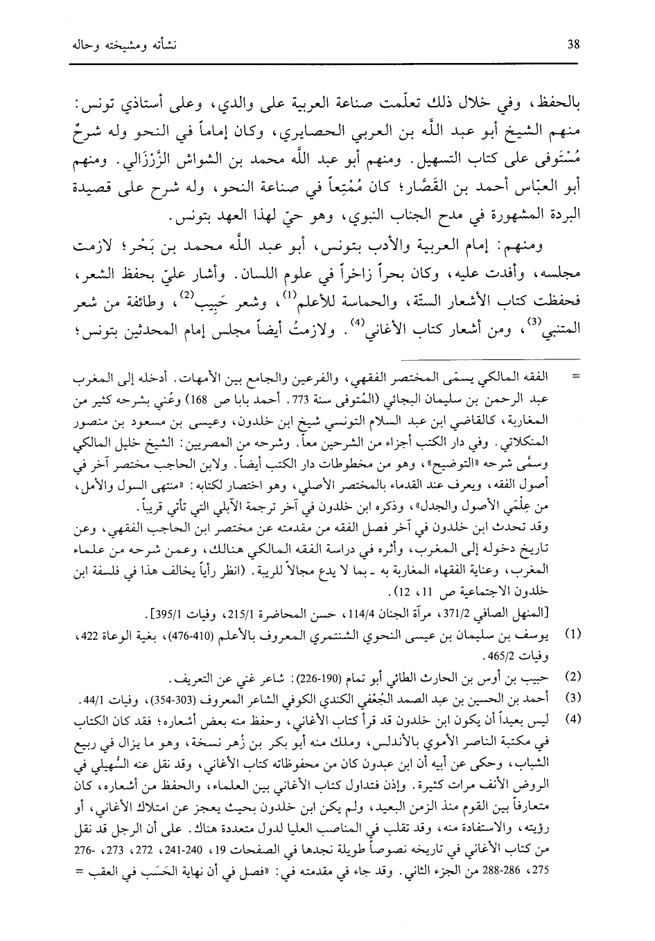 بالحفظ، وفي خلال ذلك تعلمت صناعة العربية على والدي، وعلى أستاذي تونس: منهم الشيخ أبو عبد الله بن العربي الحصايري، وكان إماماً في النحو وله شرحٌ مستوفى على كتاب التسهيل. ومنهم أبو عبد الله محمد بن الشواش الزرزالي. ومنهم أبو العباس أحمد بن القصار؛ كان ممتعاً في صناعة النحو، وله شرح على قصيدة البردة المشهورة في مدح الجناب النبوي، وهو حي لهذا العهد بتونس.