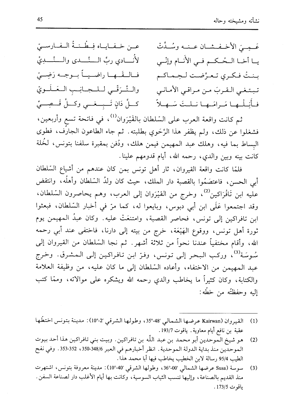 الحسن، فاعتصموا بالقصبة دار الملك، حيث كان ولد السلطان وأهله، وانتقض عليه ابن تافراكين، وخرج من القيروان إلى العرب، وهم يحاصرون السلطان، وقد اجتمعوا على ابن أبي دبوس، وبايعوا له، كما مر في أخبار السلطان، فبعثوا ابن تافراكين إلى تونس، فحاصر القصبة، وامتنعت عليه. وكان عبد المهيمن يوم ثورة أهل تونس، ووقوع الهيعة، خرج من بيته إلى دارنا، فاختفى عند أبي رحمه الله، وأقام مختفياً عندنا نحواً من ثلاثة أشهر. ثم نجا السلطان من القيروان إلى سوسة، وركب البحر إلى تونس، وفر ابن تافراكين إلى المشرق. وخرج عبد المهيمن من الاختفاء، وأعاده السلطان إلى ما كان عليه، من وظيفة العلامة والكتابة، وكان كثيراً ما يخاطب والدي رحمه الله ويشكره على موالاته، ومما كتب إليه وحفظته من خطه: