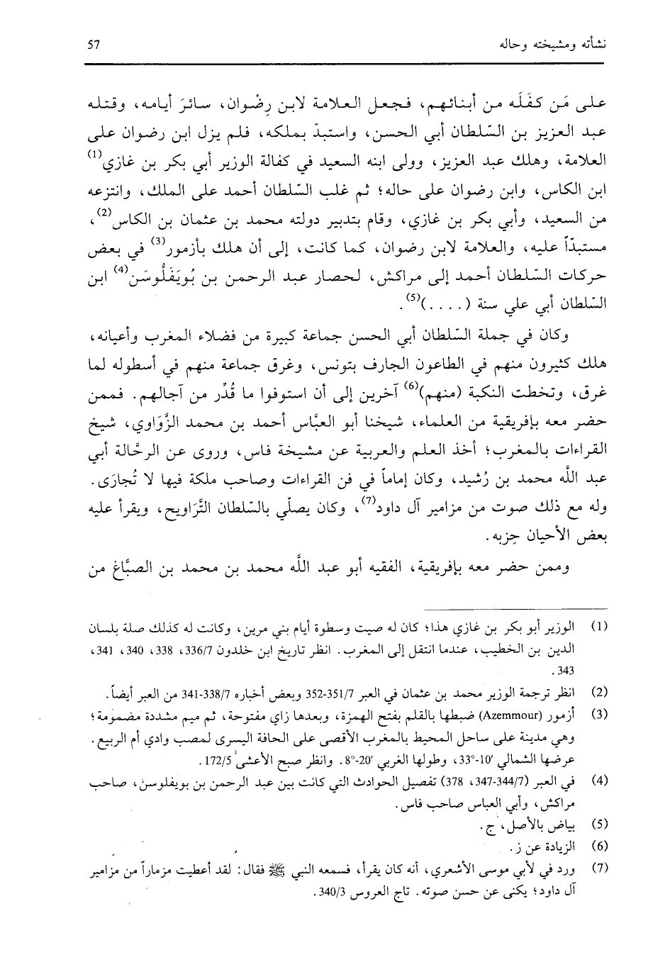 وكان في جملة السلطان أبي الحسن جماعة كبيرة من فضلاء المغرب وأعيانه، هلك كثيرون منهم في الطاعون الجارف بتونس، وغرق جماعة منهم في أسطوله لما غرق، وتخطت النكبة (منهم) آخرين إلى أن استوفوا ما قُدِّر من آجالهم. فممن حضر معه بإفريقية من العلماء، شيخنا أبو العبَّاس أحمد بن محمد الزواوي، شيخ القراءات بالمغرب؛ أخذ العلم والعربية عن مشيخة فاس، وروى عن الرحالة أبي عبد الله محمد بن رشيد، وكان إماماً في فن القراءات وصاحب ملكة فيها لا تجارى. وله مع ذلك صوت من مزامير آل داود، وكان يصلي بالسلطان التراويح، ويقرأ عليه بعض الأحيان حزبه.
