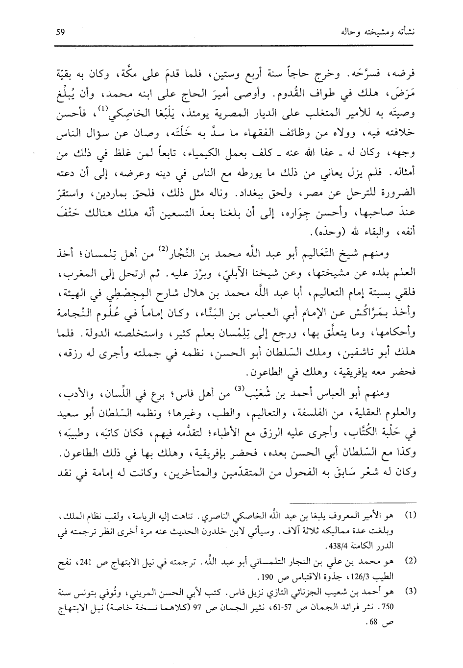 فرضه، فسرحه. وخرج حاجاً سنة أربع وستين، فلما قدم على مكة، وكان به بقية مرض، هلك في طواف القدوم. وأوصى أمير الحاج على ابنه محمد، وأن يبلغ وصيته به للأمير المتغلب على الديار المصرية يومئذ، يَلْبُغا الخاصِكي، فأحسن خلافته فيه، وولاه من وظائف الفقهاء ما سد به خلته، وصان عن سؤال الناس وجهه، وكان له - عفا الله عنه - كلف بعمل الكيمياء، تابعاً لمن غلظ في ذلك من أمثاله. فلم يزل يعاني من ذلك ما يورطه مع الناس في دينه وعرضه، إلى أن دعته الضرورة للترحل عن مصر، ولحق ببغداد. وناله مثل ذلك، فلحق بماردين، واستقر عندَ صاحبها، وأحسن جِوَاره، إلى أن بلغنا بعدَ التسعين أنه هلك هنالك حتف أنفه، والبقاء لله (وحدَه).