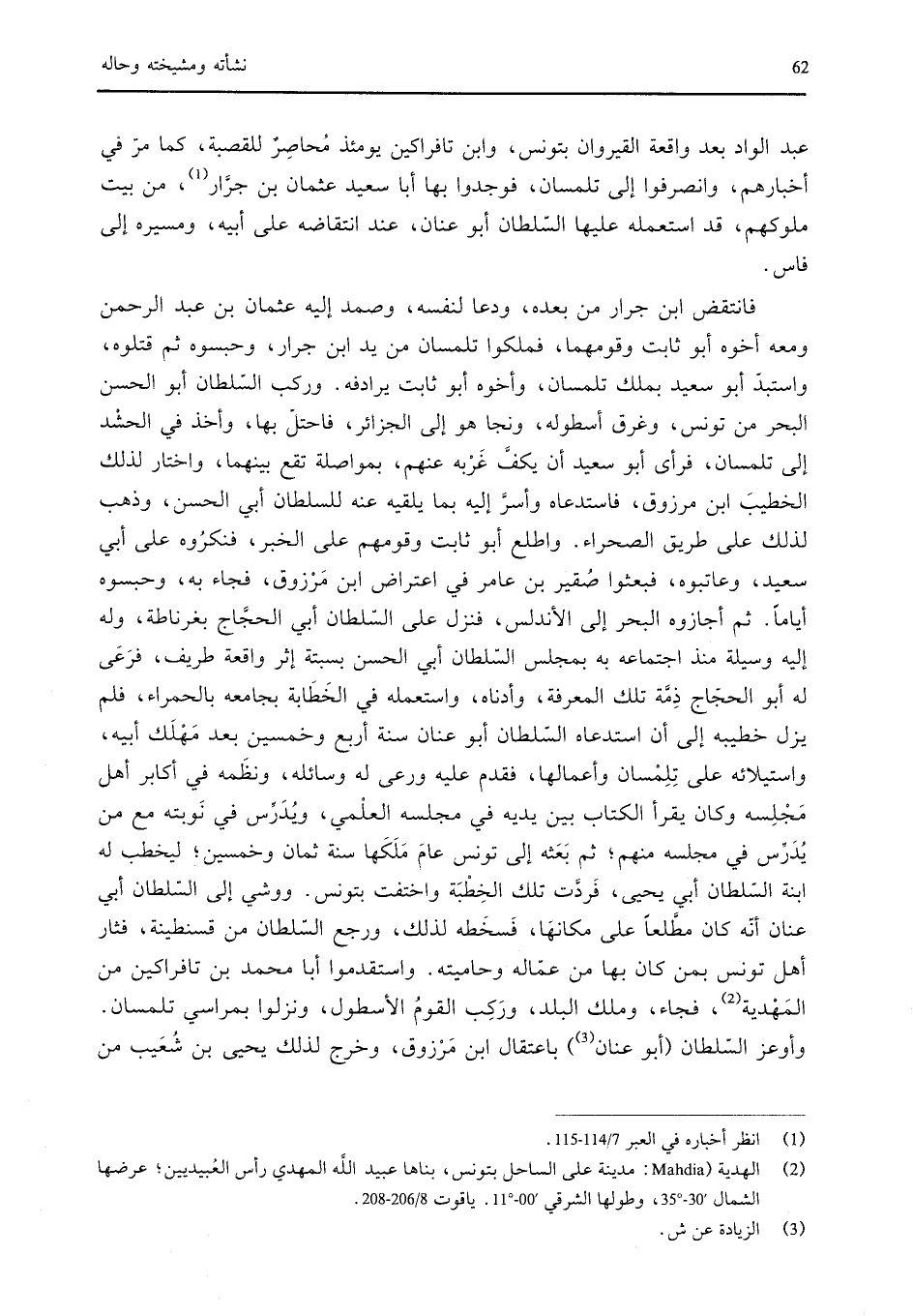 عبد الواد بعد واقعة القيروان بتونس، وابن تافراكين يومئذ محاصر للقصبة، كما مر في أخبارهم. وانصرفوا إلى تلمسان، فوجدوا بها أبا سعيد عثمان بن جرَّار، من بيت ملوكهم، قد استعمله عليها السلطان أبو عنان، عند انتقاضه على أبيه، ومسيره إلى فاس، فانتقض ابن جرار من بعده، ودعا لنفسه، وصمد إليه عثمان بن عبد الرحمن ومعه أخوه أبو ثابت وقومهما، فملكوا تلمسان من يد ابن جرار، وحبسوه ثم قتلوه، واستبد أبو سعيد بملك تلمسان، وأخوه أبو ثابت يرادفه. وركب السلطان أبو الحسن البحر من تونس، وغرق أسطوله، ونجا هو إلى الجزائر، فاحتل بها، وأخذ في الحشد إلى تلمسان، فرأى أبو سعيد أن يكف كربه عنهم، بمواصلة تقع بينهما، واختار لذلك الخطيب بن مرزوى، فاستدعاه وأسر إليه بما يلقيه عنه للسلطان أبي الحسن، وذهب لذلك على طريق الصحراء. واطلع أبو ثابت وقومهم على الخبر، فنكروه على أبي سعيد، وعاتبوه، فبعثوا ضفير ابن عامر في اعتراض ابن مرزوق، فجاء به، وحبسوه أياماً. ثم أجازوه البحر إلى الأندلس، فنزل على السلطان أبي الحجاج بغرناطة، وله إليه وسيلة منذ اجتماعه به بمجلس السلطان أبي الحسن بسبتة إثر واقعة طريف، فرعى له أبو الحجاج ذمة تلك المعرفة، وأدناه، واستعمله في الخطابة بجامعه بالحمراء، فلم يزل خطيبه إلى إن استدعاه السلطان أبو عنان سنة أربع وخمسين بعد مهلك أبيه، واستيلائه على تلمسان وأعمالها، فقدم عليه ورعى له وسائله، ونظمه في أكابر أهل مجلسه. وكان يقرأ الكتاب بين يديه في مجلسه العلمي، ويدرس في نوبته مع
