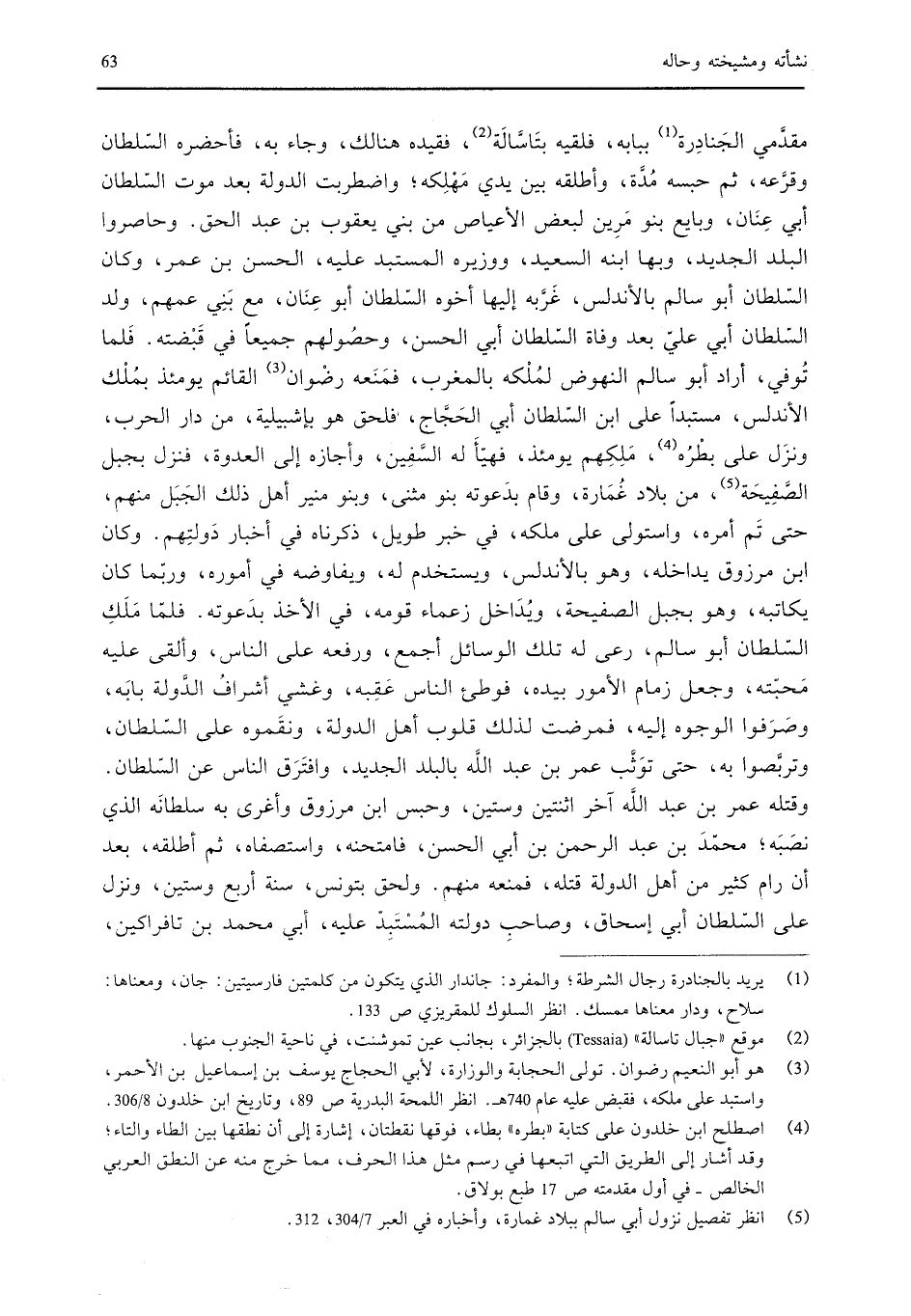 مقدمي الجنادرة ببابه، فلقيه بتاسالة، فقيده هنالك، وجاء به، فأحضره السلطان وقرعه، ثم حبسه مُدَّة، وأطلقه بين يدي مهلكه؛ واضطربت الدولة بعد موت السلطان أبي عنان، وبايع بنو مرين لبعض الأعياص من بني يعقوب بن عبد الحق. وحاصروا البلد الجديد، وبها ابنه السعيد، ووزيره المستبد عليه، الحسن بن عمر، وكان السلطان أبو سالم بالأندلس، غربه إليها أخوه السلطان أبو عنان، مع بني عمهم، ولد السلطان أبي علي بعد وفاة السلطان أبي الحسن، وحصولهم جميعاً في قبضته. فلما توفى، أراد أبو سالم النهوض لملكه بالمغرب، فمنعه رضوان القائم يومئذ بملك الأندلس، مستبداً على ابن السلطان أبي الحَجَّاج، فلحق هو بإشبيلية، من دار الحرب، ونزل على بطره، ملكهم يومئذ، فهيّأَ له السَّفِين، وأجازه إلى العدوة، فنزل بجبل الصفيحة، من بلاد غمارة، وقام بدعوته بنو مثنى، وبنو منير أهل ذلك الجبل منهم، حتى تم أمره، واستولى على ملكه، في خبر طويل، ذكرناه في أخبار دولتهم. وكان ابن مرزوق يداخله، وهو بالأندلس، ويستخدم له، ويفاوضه في أموره، وربما كان يكاتبه، وهو بجبل الصفيحة، ويداخل زعماء قومه، في الأخذ بدعوته. فلما ملك السلطان أبو سالم، رعى له تلك الوسائل أجمع، ورفعه على الناس، وألقى عليه محبته، وجعل زمام الأمور بيده، فوطئ الناس عقبه، وغشي أشراف الدولة بابه، وصرفوا الوجوه
