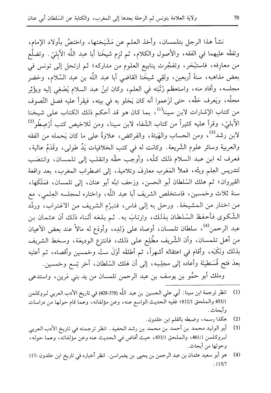 كله، وأوجب حقه وانقلب إلى تلمسان، وانتصب لتدريس العلم وبثه، فملأ المغرب معارف وتلاميذ، إلى اضطراب المغرب، بعد واقعة القيروان؛ ثم هلك السلطان أبو الحسن، وزحف ابنه أبو عنان، إلى تلمسان، فملكها، سنة ثلاث وخمسين، فاستخلص الشريف أبا عبد الله، واختاره لمجلسه العلمي، مع من اختار من المشيخة. ورحل به إلى فاس، فتبرم الشريف من الاغتراب، وردد الشكوى فأحفظ السلطان بذلك، وارتاب به. ثم بلغه أثناء ذلك أن عثمان بن عبد الرحمن، سلطان تلمسان، أوصاه على ولده، وأودع له مالاً عند بعض الأعيان من أهل تلمسان، وأن الشريف مطلع على ذلك، فانتزع الوديعة، وسخط الشريف بذلك ونكبه، وأقام في اعتقاله أشهراً، ثم أطلقه أول ست وخمسين وأقصاه، ثم أعتبه بعد فتح قسنطينة وأعاده إلى مجلسه، إلى أن هلك السلطان، آخر تسع وخمسين.
