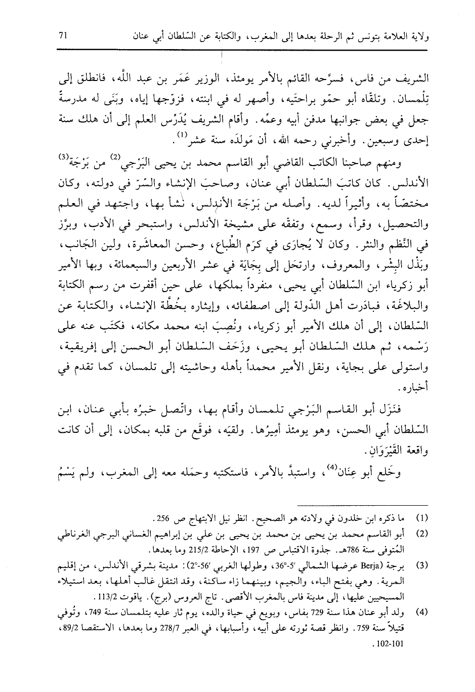 الأندلس. كان كاتب السلطان أبي عنان، وصاحب الإنشاء والسر في دولته، وكان مختصاً به، وأثيراً لديه. وأصله من برجة الأندلس، نشأ بها، واجتهد في العلم والتحصيل، وقرأ، وسمع، وتفقه على مشيخة الأندلس، واستبحر في الأدب، وبرز في النظم والنثر. وكان لا يجارى في كرم الطباع، وحسن المعاشرة، ولين الجانب، وبذل البشر، والمعروف، وارتحل إلى بجاية في عشر الأربعين والسبعمائة، وبها الأمير أبو زكرياء ابن السلطان أبي يحيى، منفرداً بملكها، على حين أقفرت من رسم الكتابة والبلاغة، فبادرت أهل الدولة إلى اصطفائه، وإيثاره بخطة الإنشاء، والكتابة عن السلطان، إلى أن هلك الأمير أبو زكرياء، ونصب ابنه محمد مكانه، فكتب عنه على رسمه، ثم هلك السلطان أبو يحيى، وزحف السلطان أبو الحسن إلى إفريقية، واستولى على بجاية، ونقل الأمير محمداً بأهله وحاشيته إلى تلمسان، كما تقدم في أخباره. فنزل أبو القاسم البرجي تلمسان وأقام بها، واتصل خبره بأبي عنان، ابن السلطان أبي الحسن، وهو يومئذ أميرها. ولقيه، فوقع من قليه بمكان، إلى أن كانت واقعة القيروان.